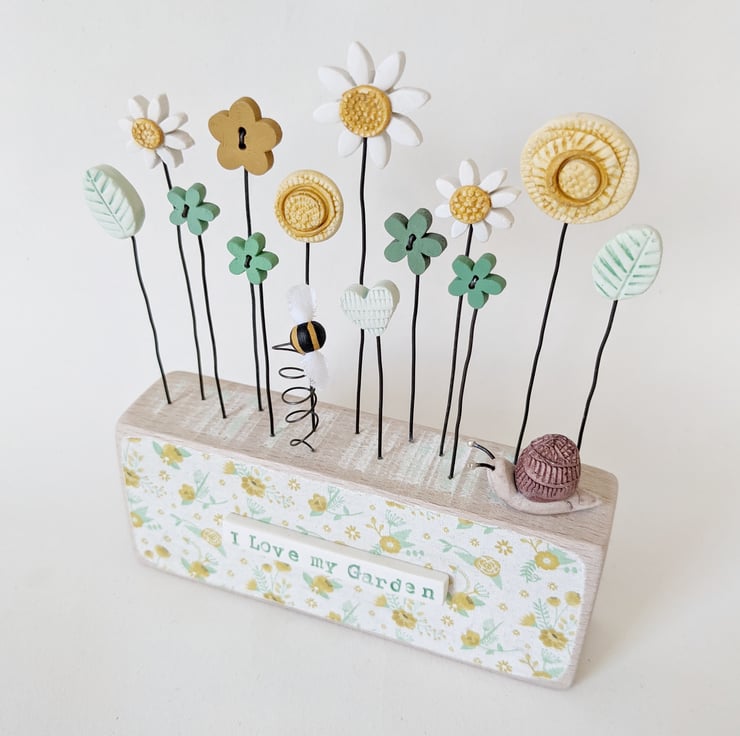 Button and clay flowers grow in this flower garden, standing on their wire stalks in a decoupaged beech wood block.