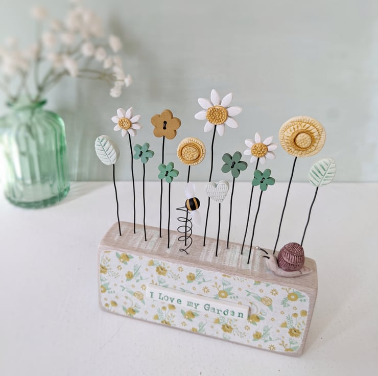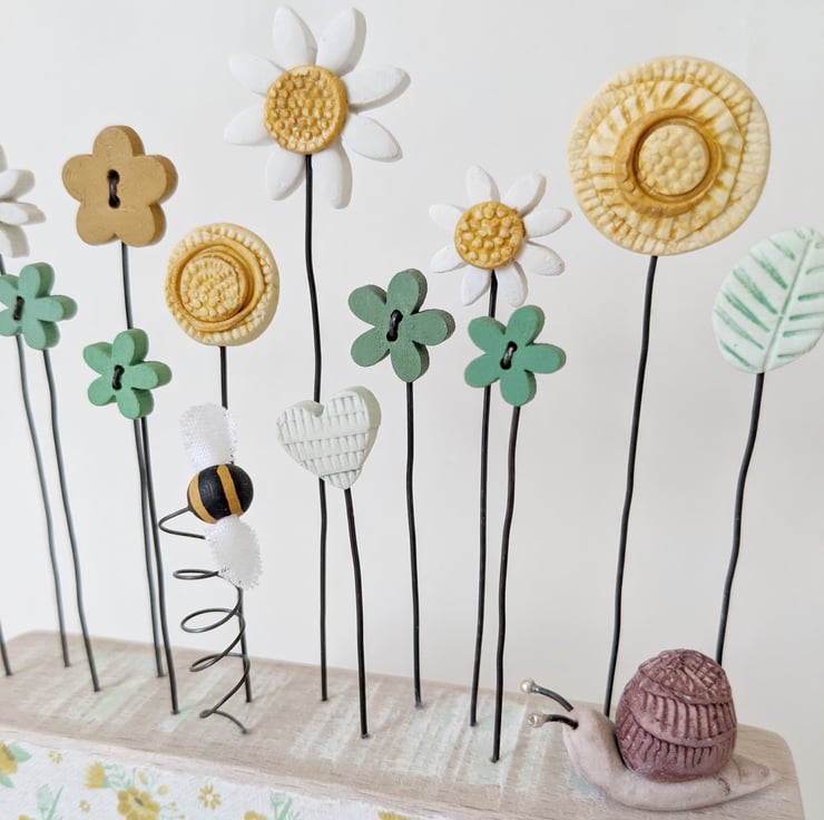 There are little wooden button flowers dancing alongside a daisies, sunflowers, a heart, and leaves made from polymer clay. This is hand moulded, fired and painted to finish.