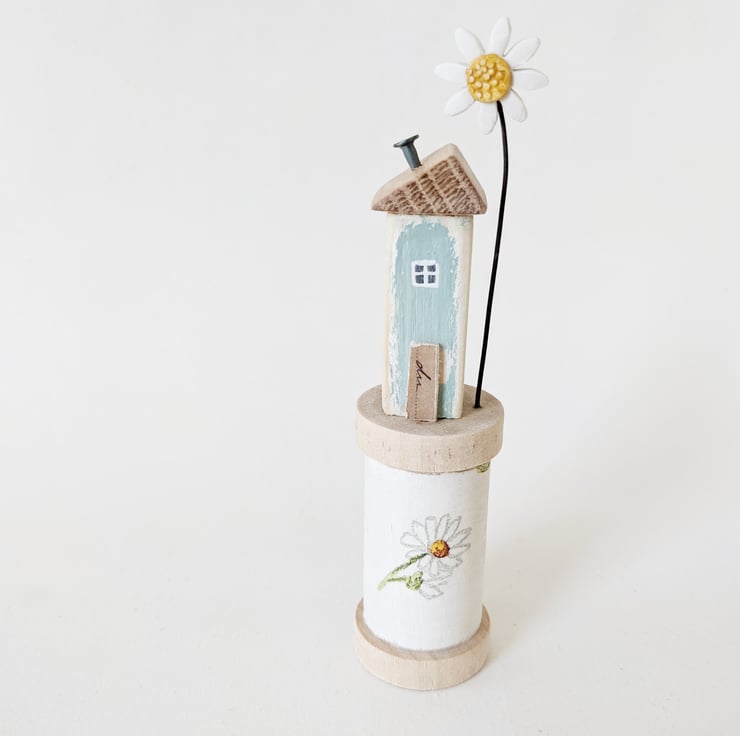 A hand painted little house sits on a wooden bobbin. A patterned and painted clay daisy flower stands beside it.