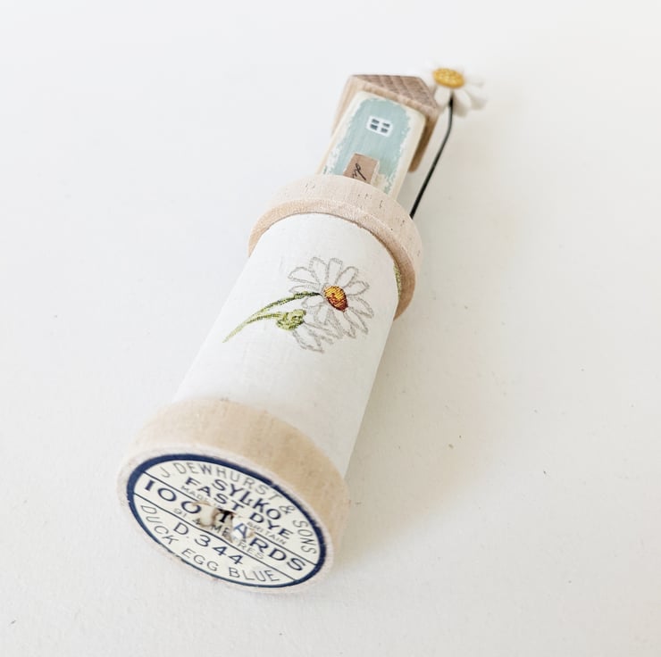 I love a wooden bobbin, they are little treasures, and my teeny homes sit perfectly on top.