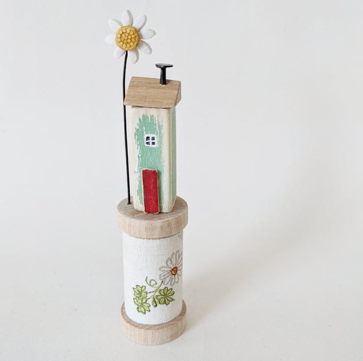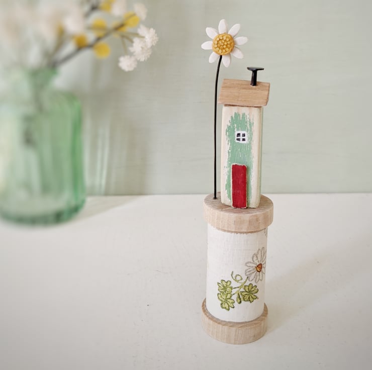 A hand painted little house sits on a wooden bobbin. A patterned and painted clay daisy flower stands beside it.