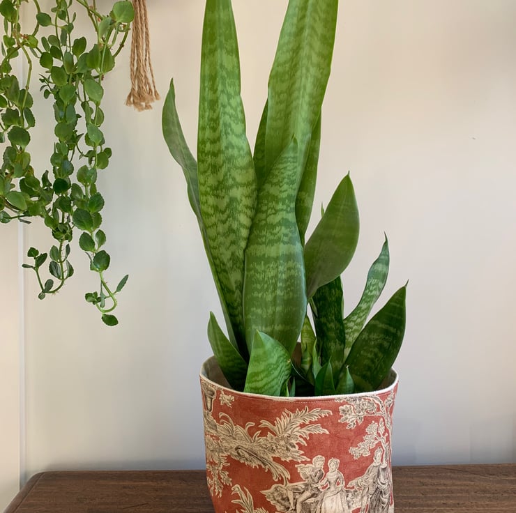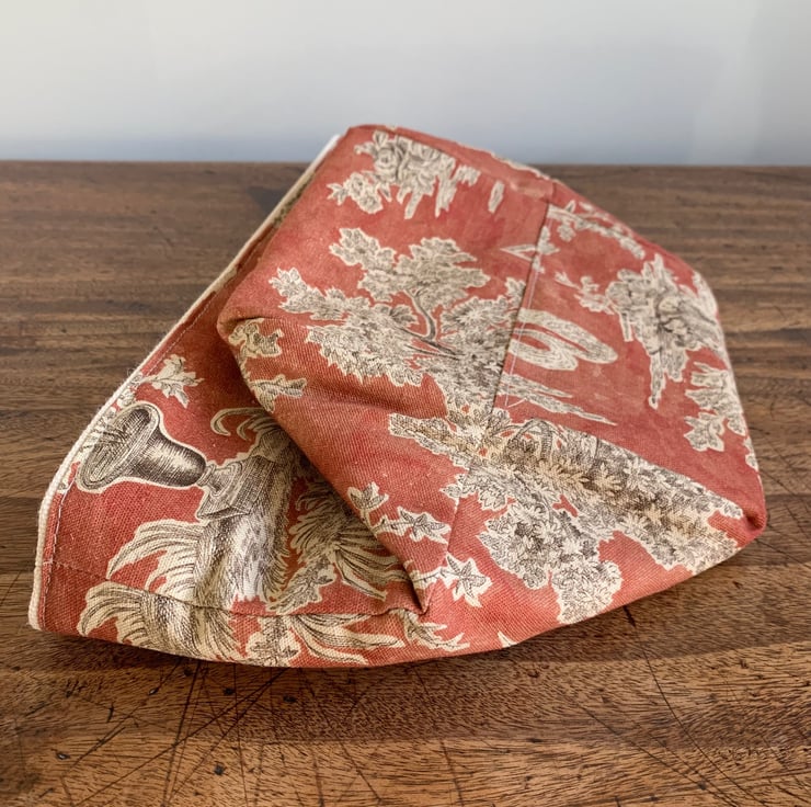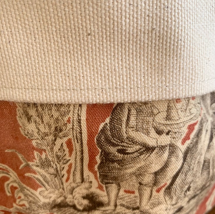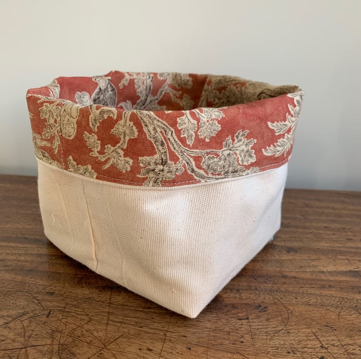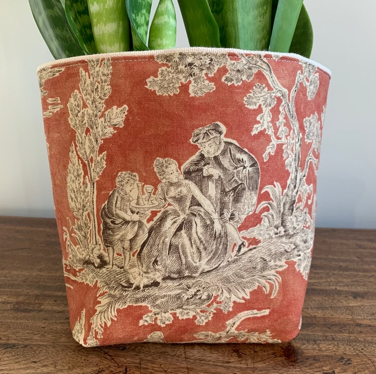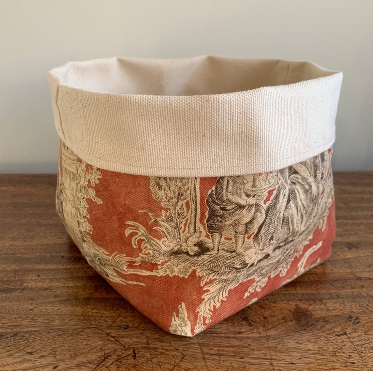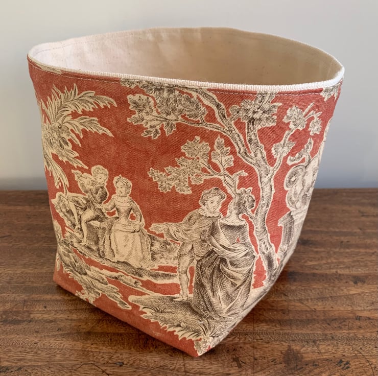 Reversible fabric storage basket made from russet Sanderson Josette Toile de Jouy cotton and sturdy cream cotton canvas. Can be used with a turn-down to make the most of the contrasting fabrics.