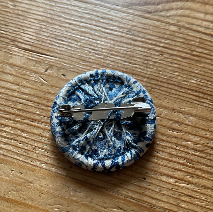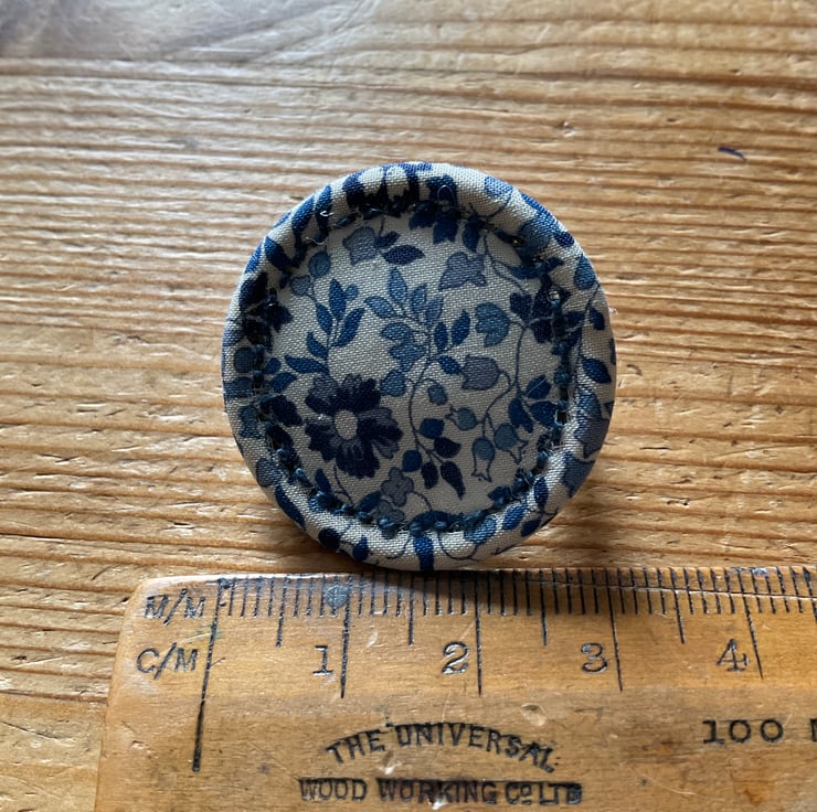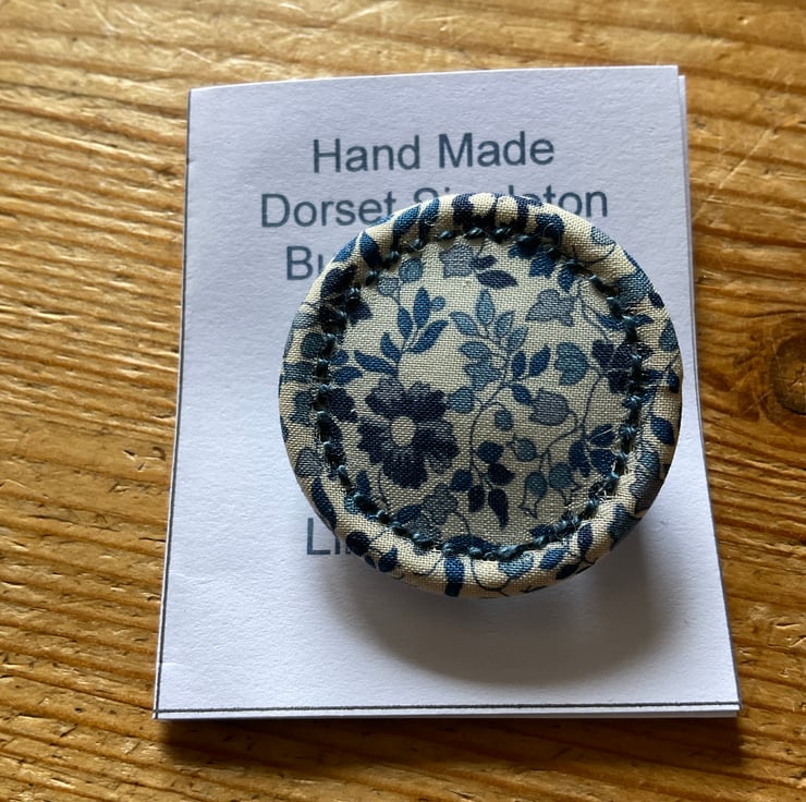This brooch is made from an early type of traditional Dorset Button known as the Singleton. What makes this brooch special is that the fabric used in its construction is a Liberty print fine cotton lawn in the design ‘Katie and Millie’ with stitched detail worked in toning dark blue cotton.