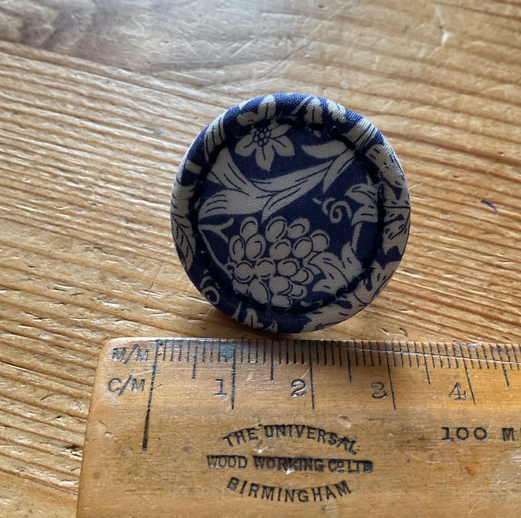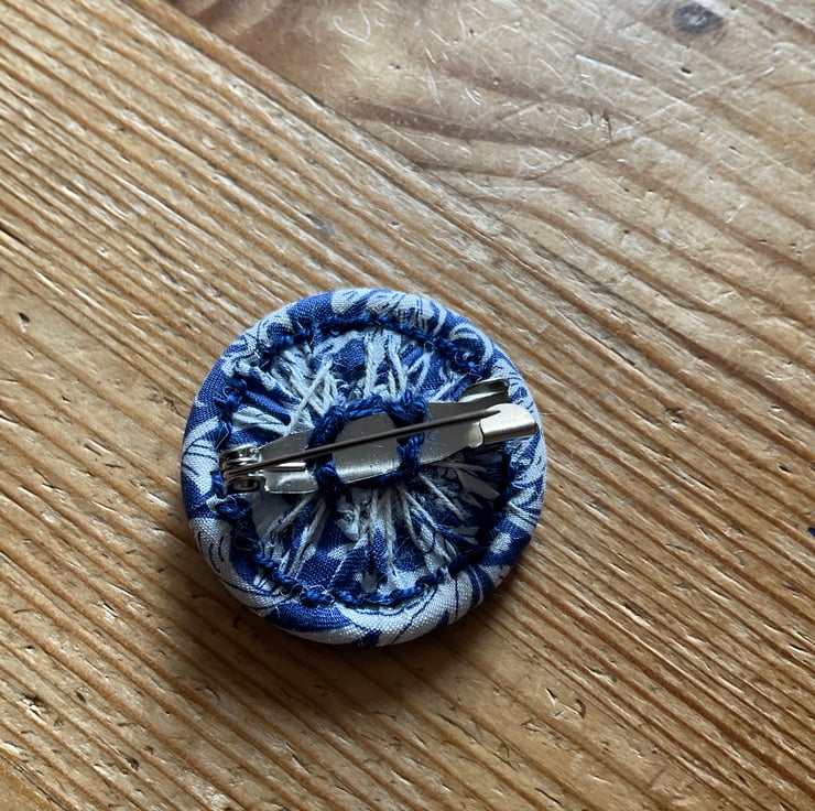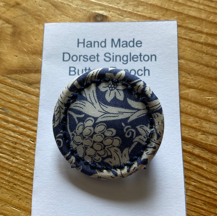 This brooch is made from an early type of traditional Dorset Button known as the Singleton. What makes this brooch special is that the fabric used in its construction is a Liberty print fine cotton lawn in the design ‘Theberton’ with stitched detail worked in toning dark blue cotton.