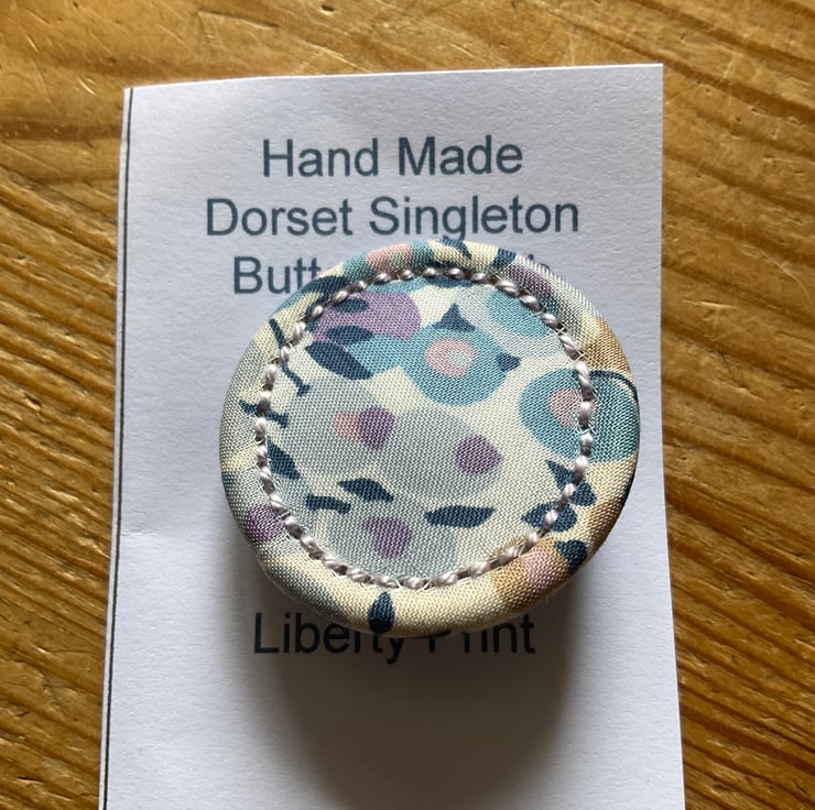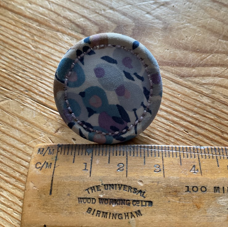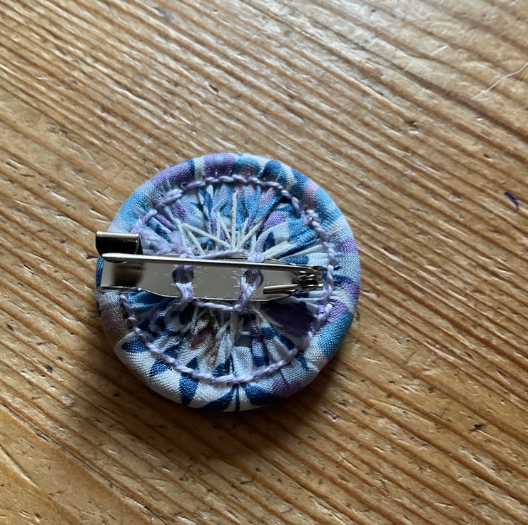This brooch is made from an early type of traditional Dorset Button known as the Singleton. What makes this brooch special is that the fabric used in its construction is a Liberty print fine cotton lawn in the design ‘Wiltshire’ with stitched detail worked in toning pale lilac cotton.