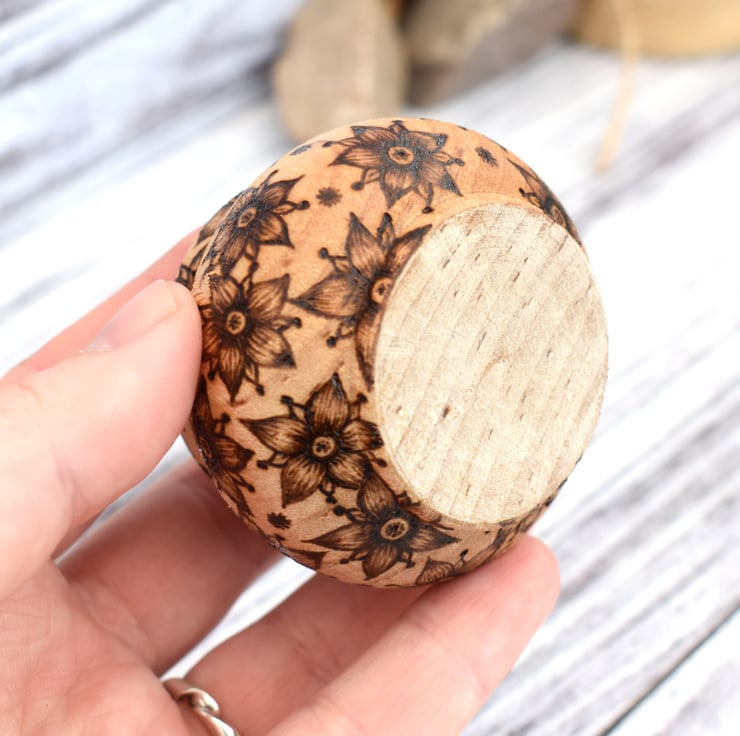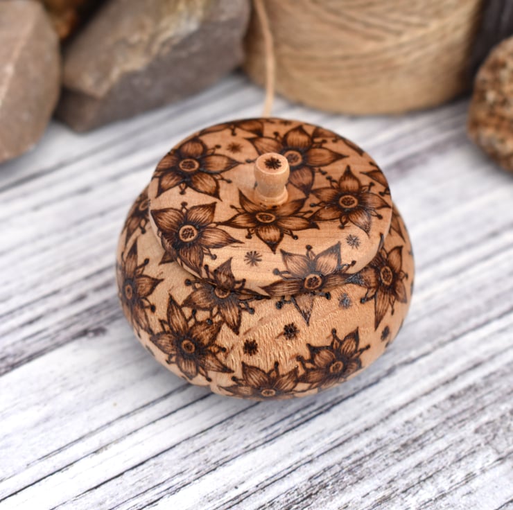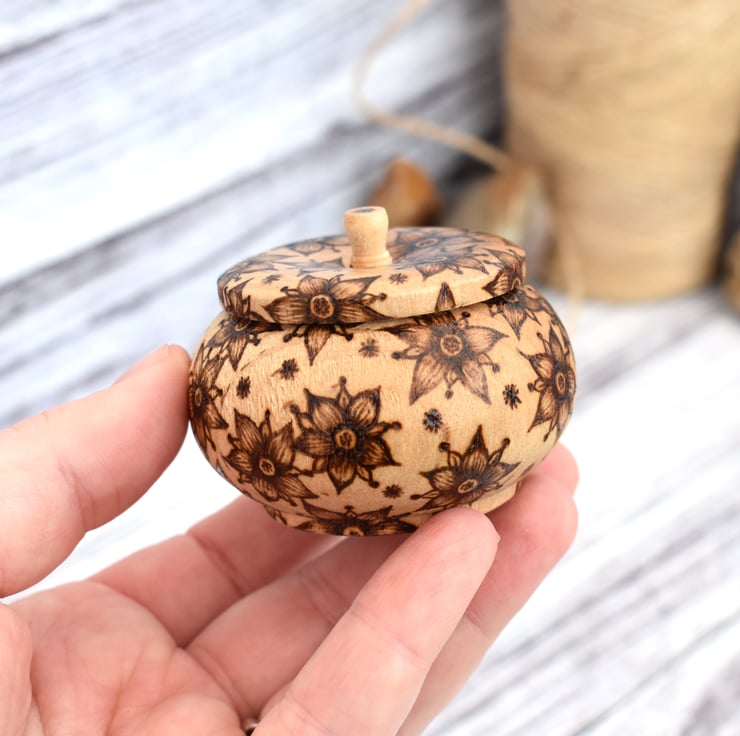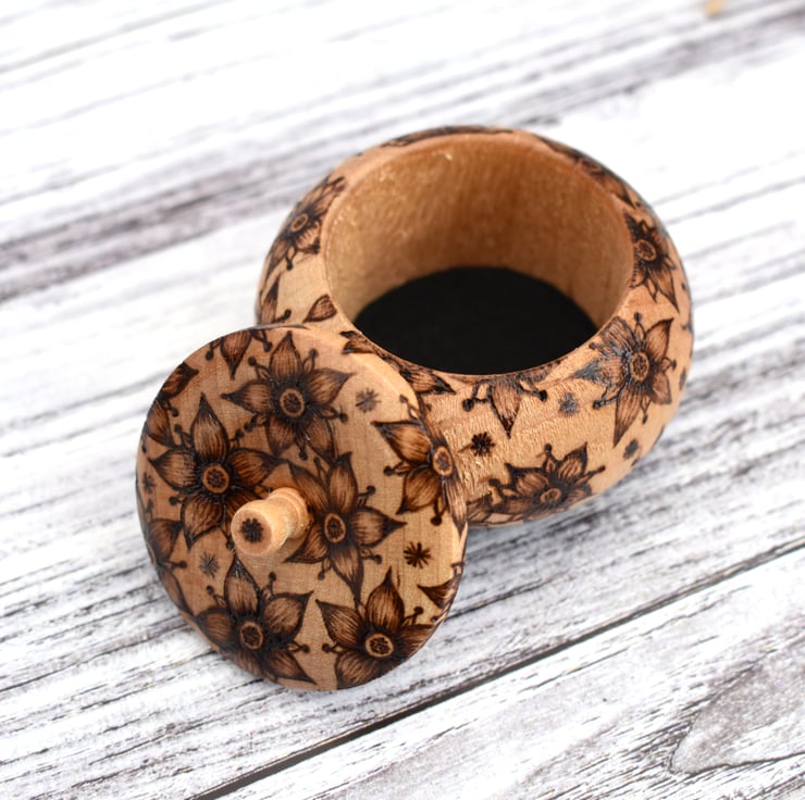A beautiful, small, lidded pot with a floral design. Hand burned using pyrography.