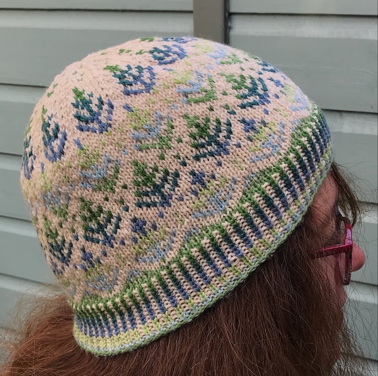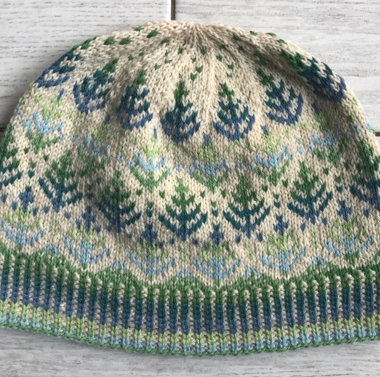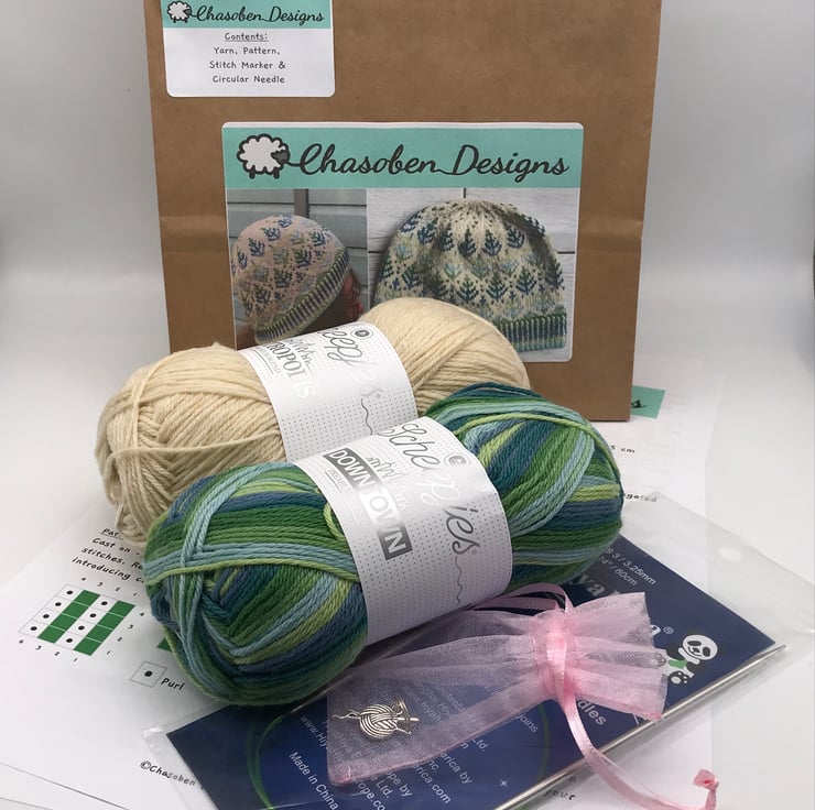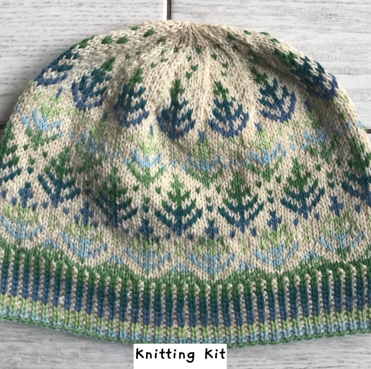 This kit is of a Fair Isle Hat which is in the design of Fir Trees and is a perfect accompaniment to the cowl in the same design. The Forest colour way is darker than the Pastel version. It is knitted on a circular needle and then you need to move onto Double Pointed Needles as the stitches decrease. The coloured rib starts the pattern, which then takes you to the main body of the pattern and then finishing with decreasing to shape the crown. (This is done by k2tog) There is 2 clear colourful charts to show the Fair isle pattern.