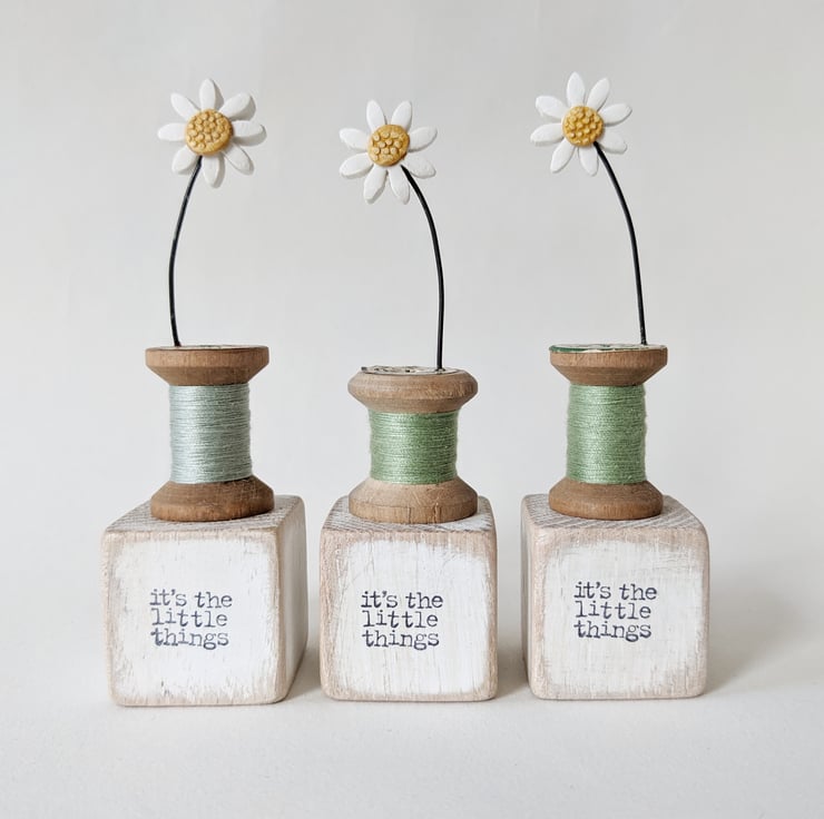 The painted oak block beneath has the hand stamped words 'it's the little things'