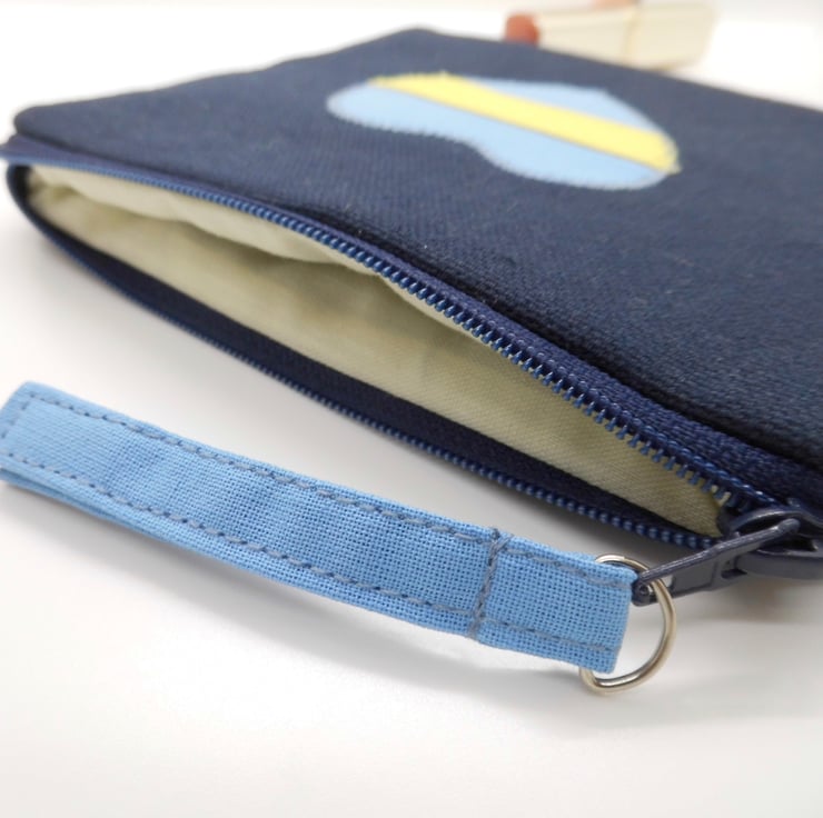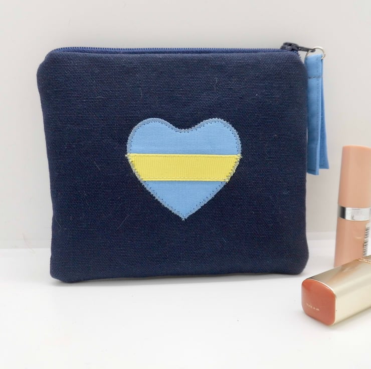 I made this make up bag using a strong navy blue cotton fabric. On the front I have appliquéd a blue heart with a yellow ribbon stripe as a representation of the Ukrainian flag. Lined with pale cream/lemon poly/cotton and in between the two layers is a layer of felt to give the bag body and a quality feel.