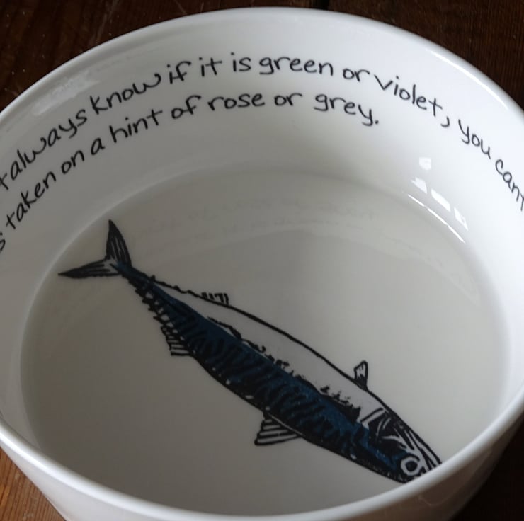 My lino print design has been combined in this piece with a variation on the Vincent Van Gogh quote: "The Mediterranean has the colour of mackerel, changeable I mean. You don't always know if it is green or violet, you can't even say it's blue, because the next moment the changing reflection has taken on a tint of rose or grey."
