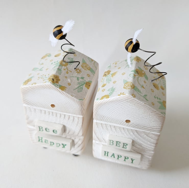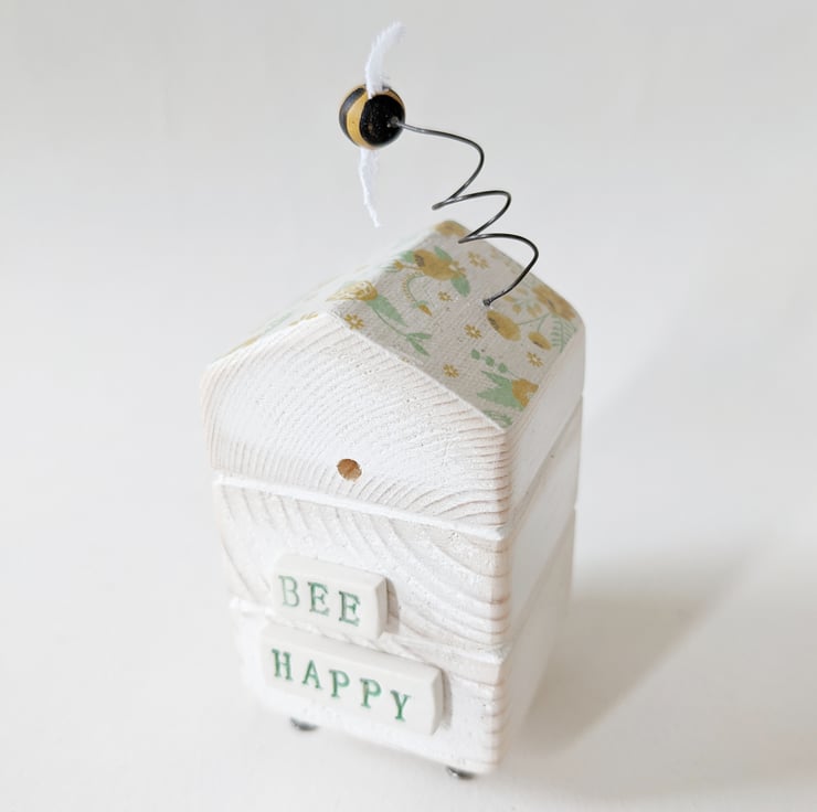 This little beehive is hand carved and painted, with a floral decoupage roof! A tiny stripy bee buzzes above.