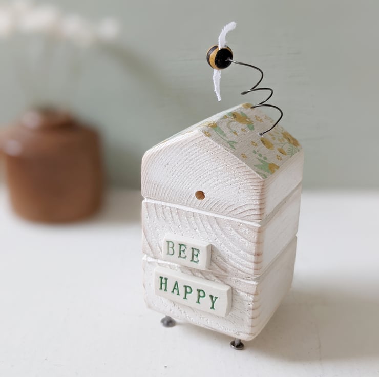 Painted white and sanded smooth the roof of the hive is adorned with flowers and the little bee dances on a bendy wire. The sign on the front reads 'Bee Happy' and is made from polymer clay which is shaped, fired and painted.