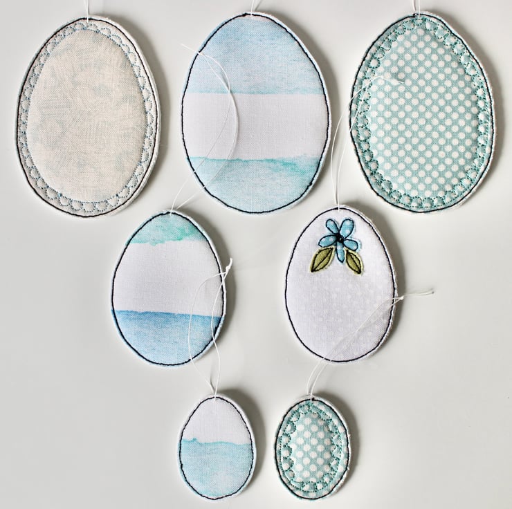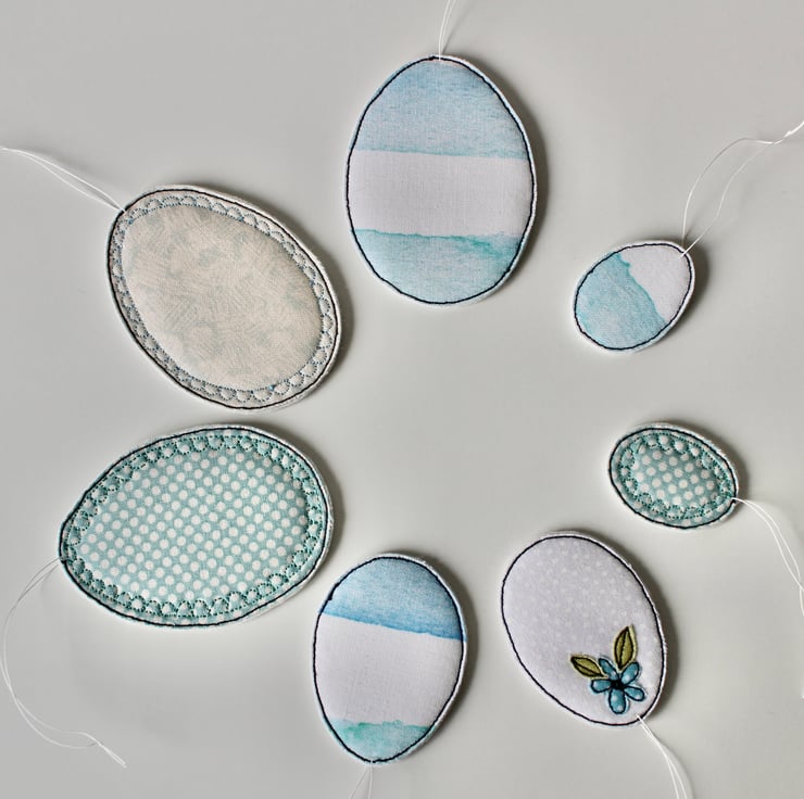 Each egg is sewn using 100% wool felt, cotton cloth and free hand machine embroidery; multiple layers of cloth are sewn together and cut out by hand using very sharp scissors. With a linen string to suspend.