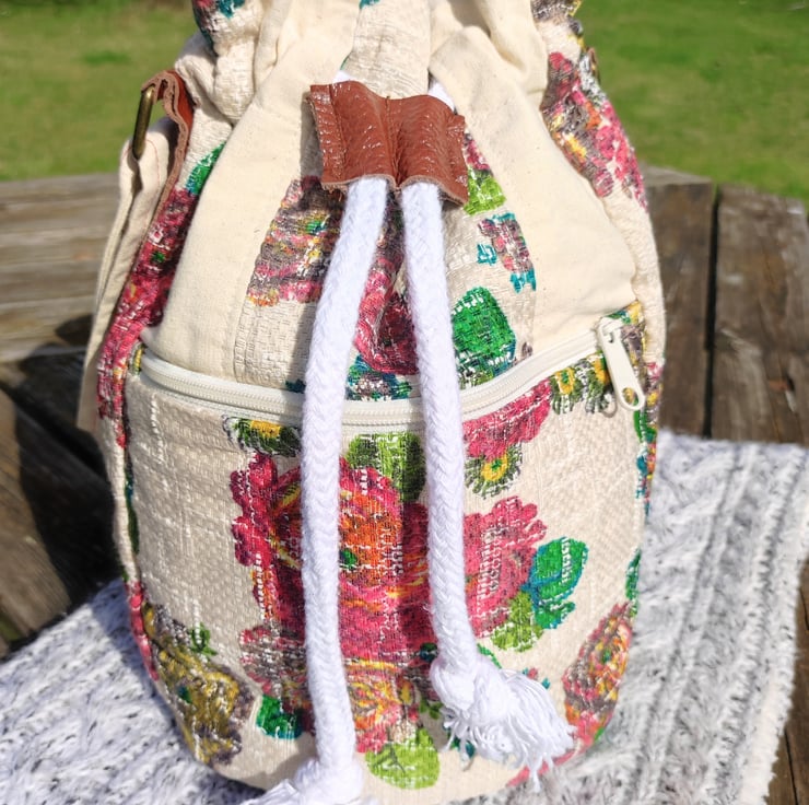 I combined different fabrics: cotton, canvas and a delicate rose woven fabric, with a flower power feel.