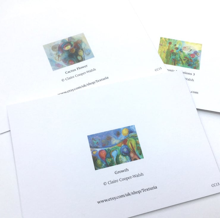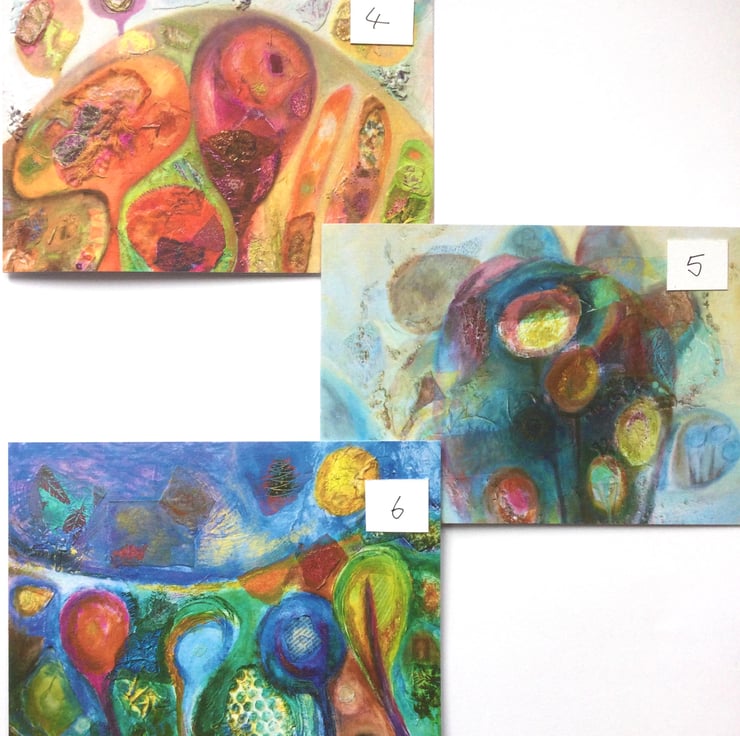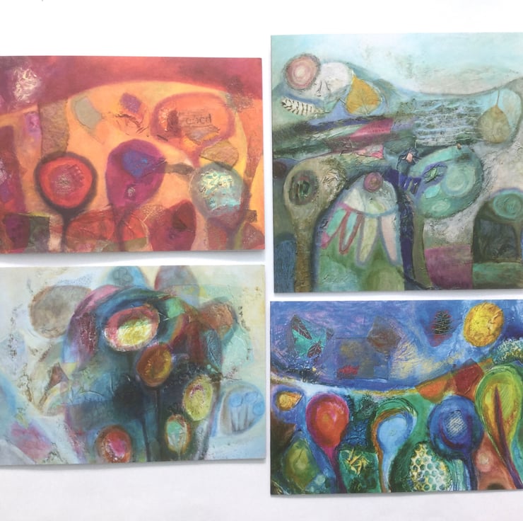 Choose any 4 blank greetings cards from a choice of 10 and message me with the design numbers. These are environmentally friendly, Fine Art greeting cards, blank inside for your own message. They are reproductions of my mixed media and textile paintings and are printed on good quality, smooth white recycled 300 gms card. They are size 140 x 140mm and 104 x 150mm and are suitable for any occasion. They come with white recycled envelopes and are individually wrapped in recycled tissue paper, rather than cello sleeves. They would also make very original and affordable wall art if mounted and framed.
