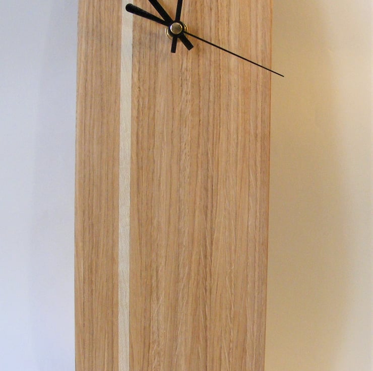 Oak and Holly laminated clock 400 x 120 x 10mm, A lovely wooden clock face fitted with a quality quartz movement (including a hanging hook) and black metal hands. Made from reclaimed materials it has strips of Oak and a single strip of pale Holly towards one side, providing a nice contrast. The Oak is a lovely honey colour and has a nice grain including some of the rays that Oak is known for. It would make a lovely addition to any room in the house.