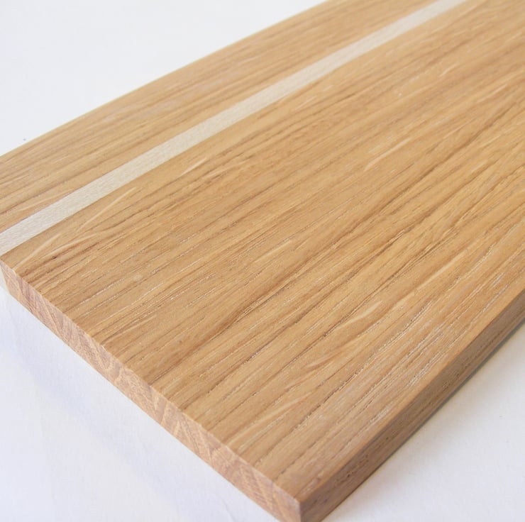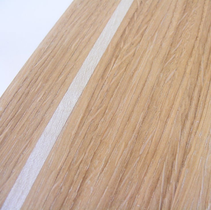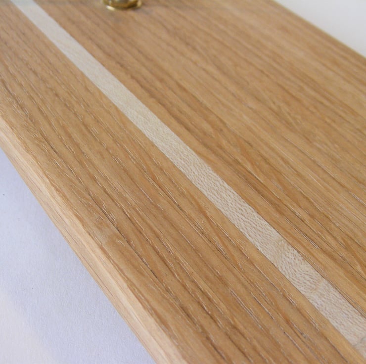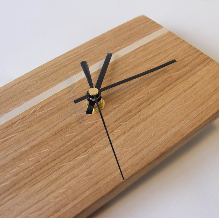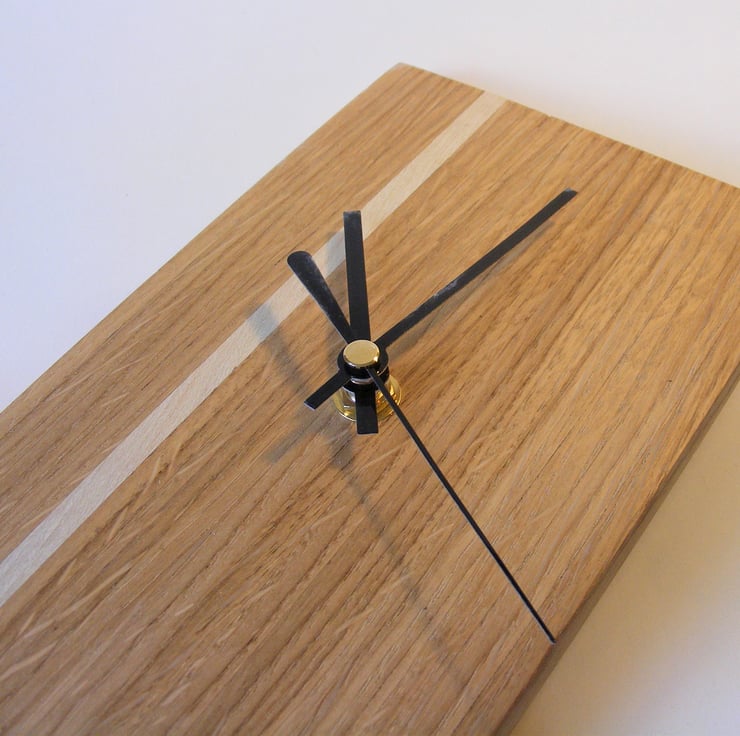 Oak and Holly laminated clock 400 x 120 x 10mm, A lovely wooden clock face fitted with a quality quartz movement (including a hanging hook) and black metal hands. Made from reclaimed materials it has strips of Oak and a single strip of pale Holly towards one side, providing a nice contrast. The Oak is a lovely honey colour and has a nice grain including some of the rays that Oak is known for. It would make a lovely addition to any room in the house.