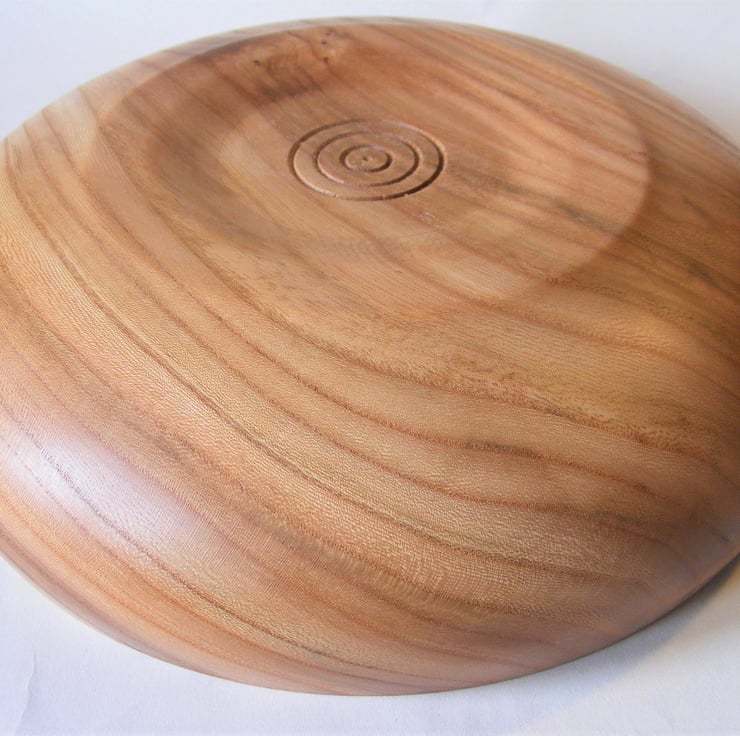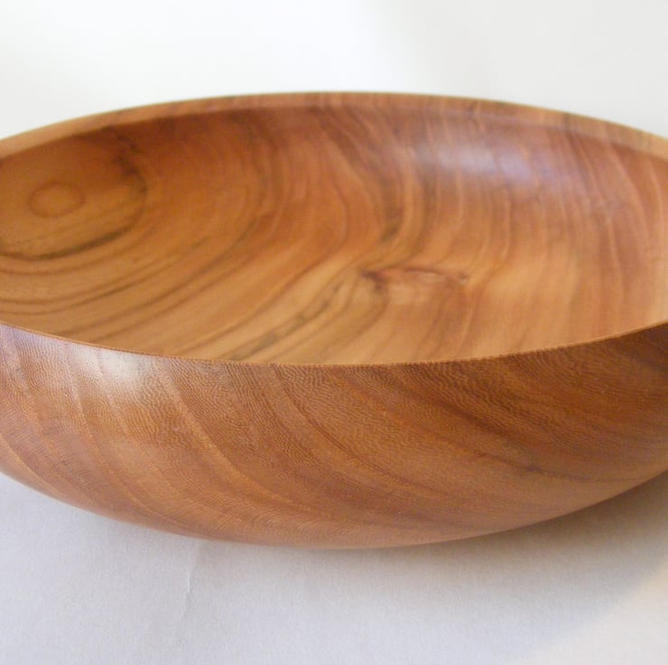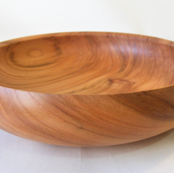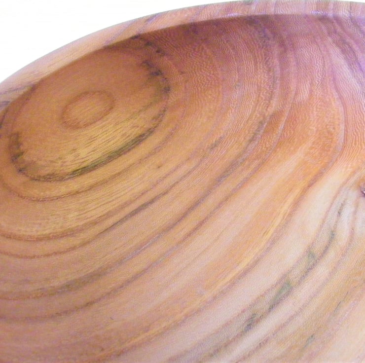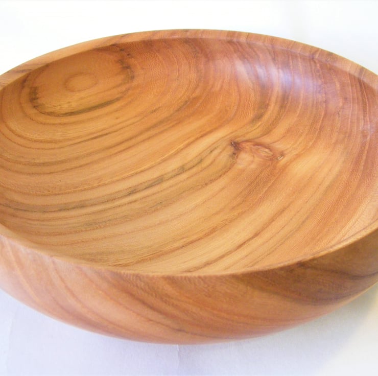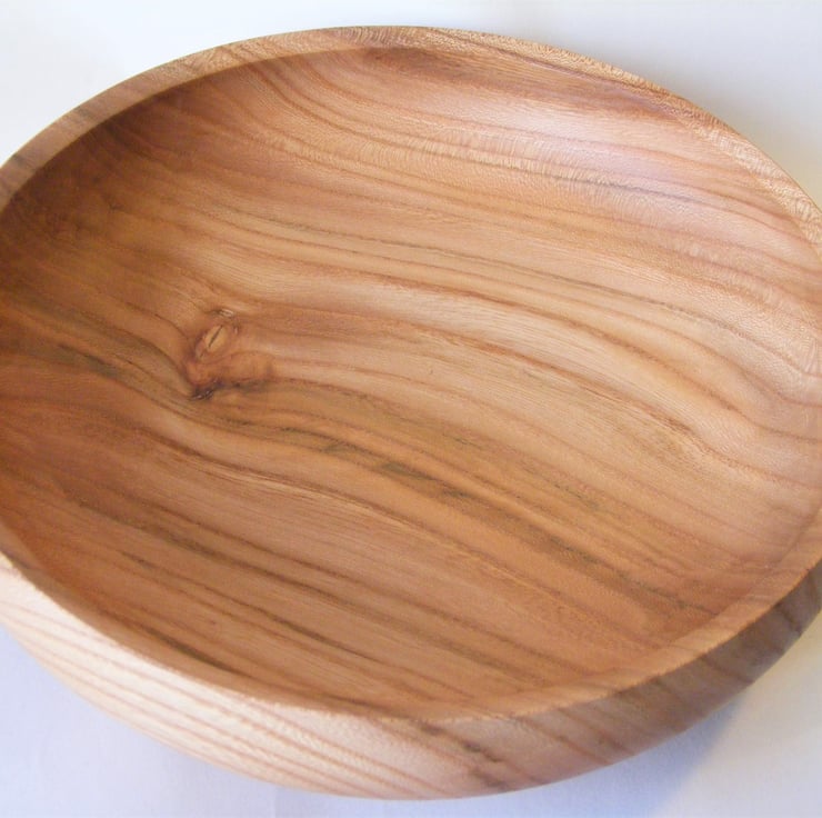 Elm Fruit or Salad bowl, 240 x 60 mm, with a food safe finish. A large and striking Elm fruit bowl, it has a slightly closed form shape, with an in-turned rim, it has a good stable base. The colour is a redish brown, with streaks of different shades, it has a knot in the base which makes the pattern of grain even more interesting. Between the streaks and grain pattern the wood has a very fine pattern of checks and swirls.