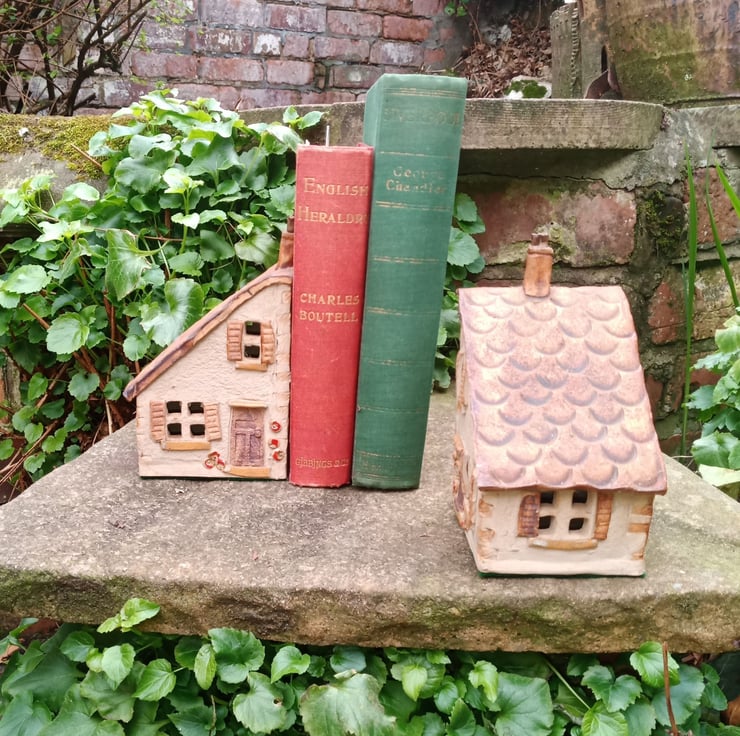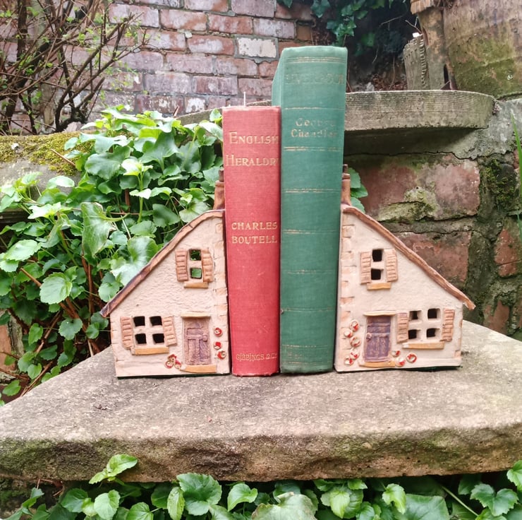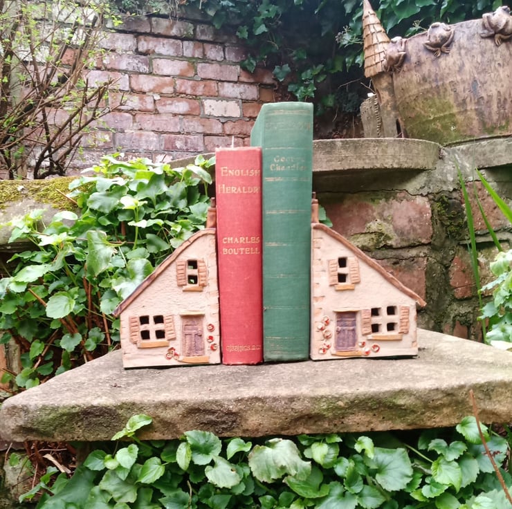 Stunning ceramic bookends in the shape of cottages with tiled rooves shuttered windows and flowers growing around the door. Hand made in stoneware clay glazed in natural shades of brown and cream.