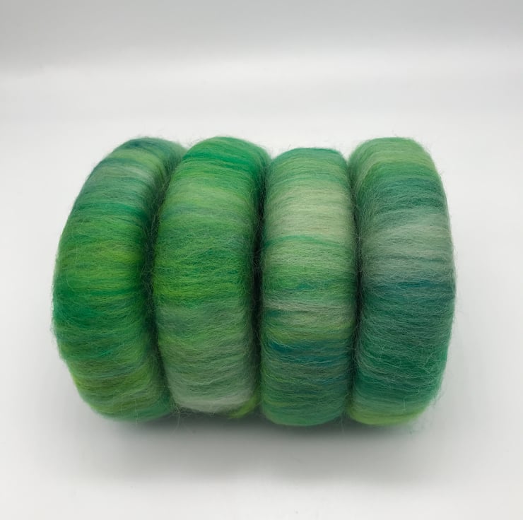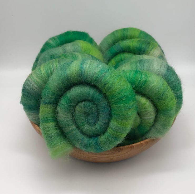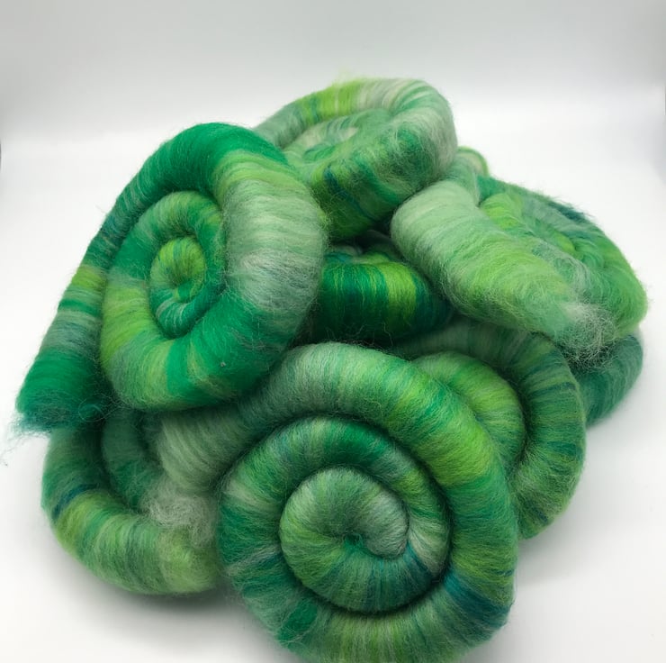 I’ve used Merino in many greens including emerald, lime, spearmint & thyme. Along side a deep green Mulberry Silk to give these rolags an luxurious silky feel to these beautiful hand blended rolags.