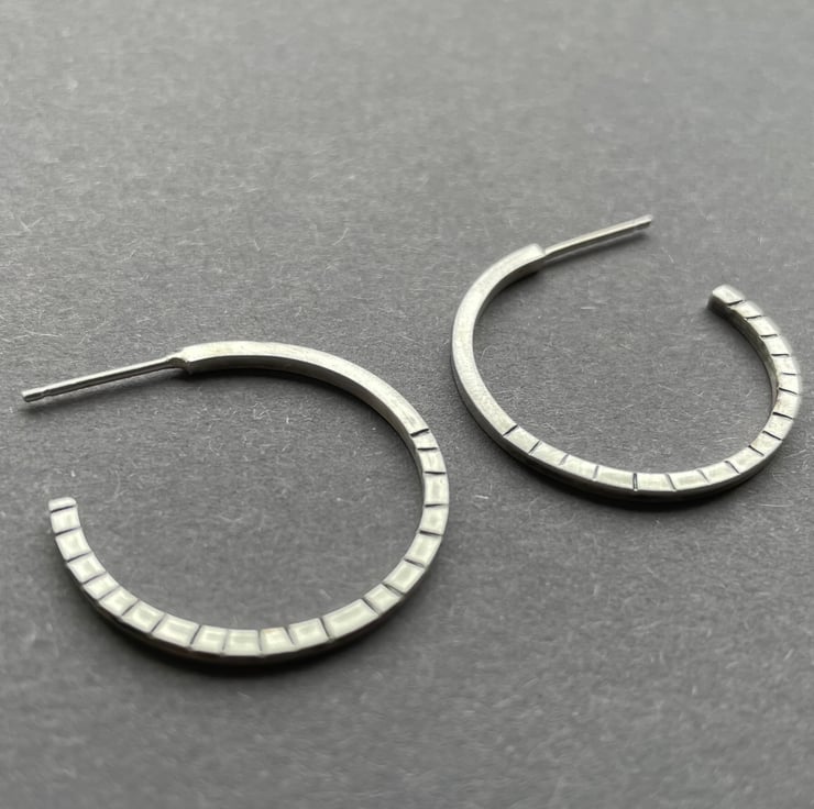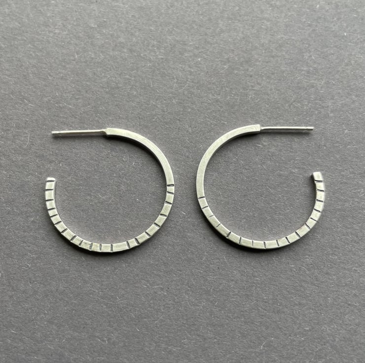 A lovely pair of silver hoops hand made from sterling silver square wire. The surface has little lines around half of the circle which have been oxidised and rubbed back for texture.