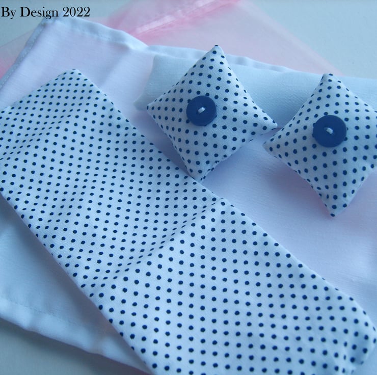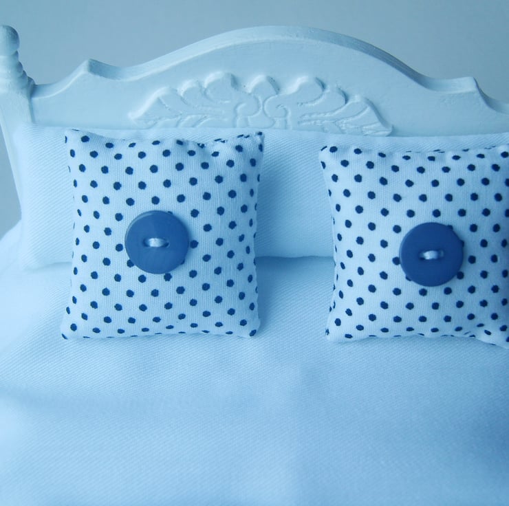 2x White & blue polka dot cotton scatter cushions filled with hollow fibre filling and blue plastic button detail