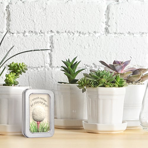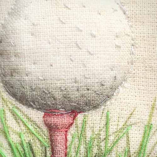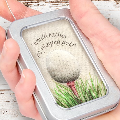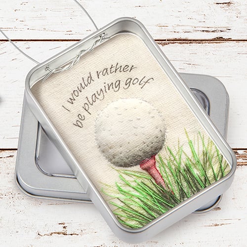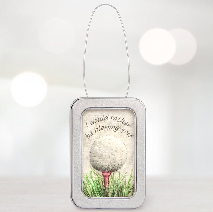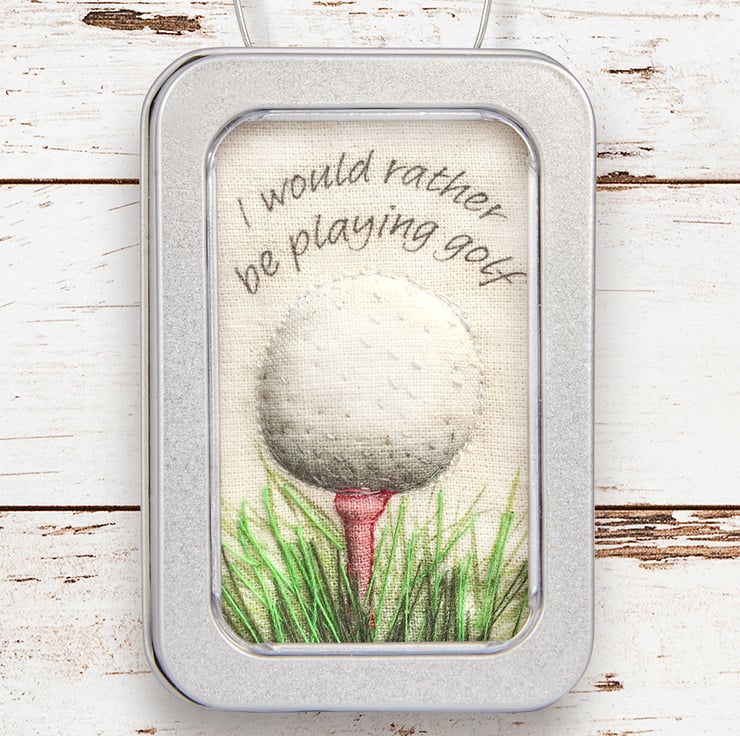 Golf gift, hand embellished, textile print - stitched and framed in a tin, with a loop to hang it up