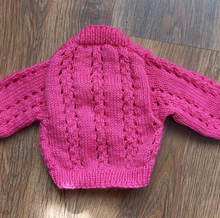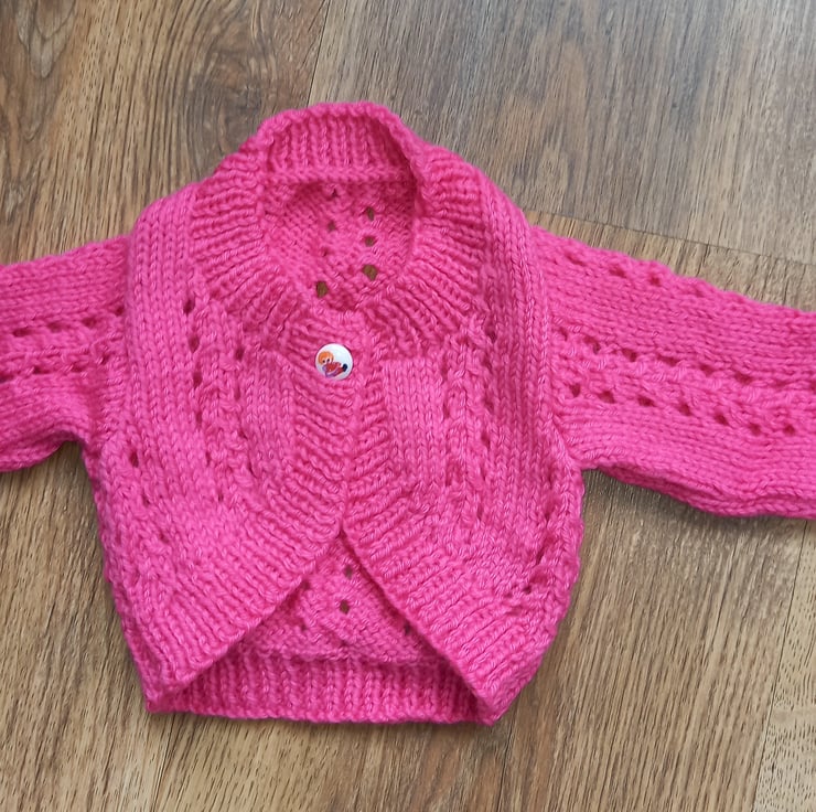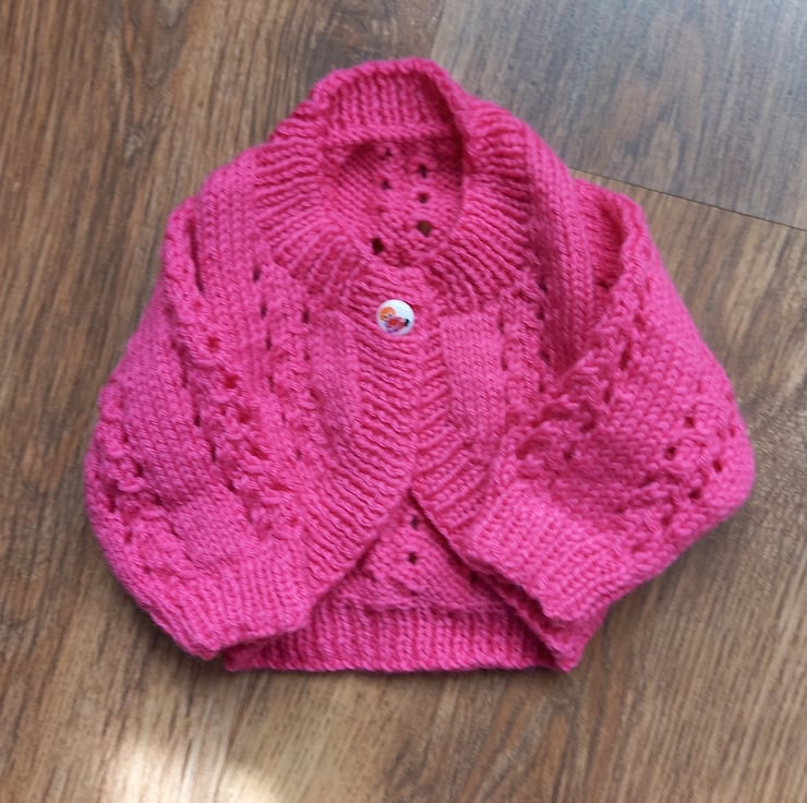Hand knitted baby girls cardigan/bolero, lovely soft machine washable acrylic yarn, in pink with a lacy design on the front, back and sleeves, fastened with one single button with a picture of a doll on it.
