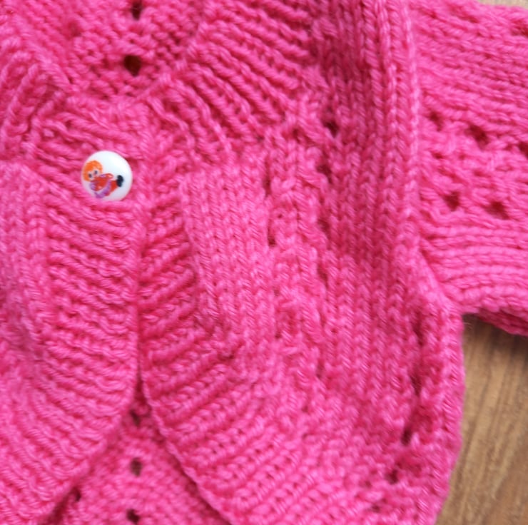 Hand knitted baby girls cardigan/bolero, lovely soft machine washable acrylic yarn, in pink with a lacy design on the front, back and sleeves, fastened with one single button with a picture of a doll on it.
