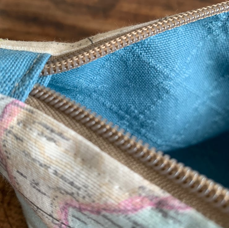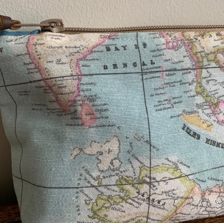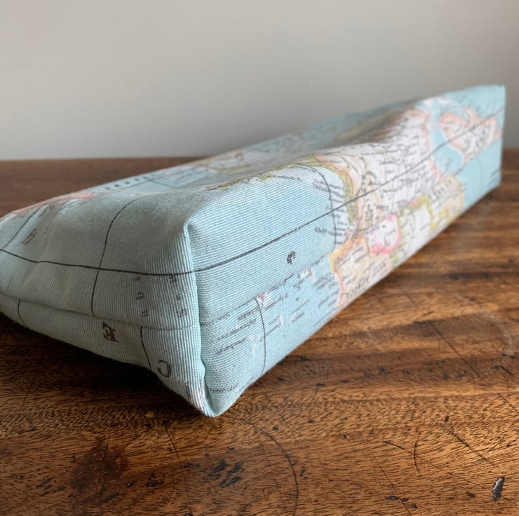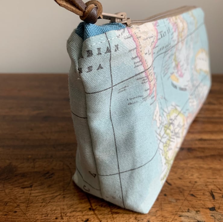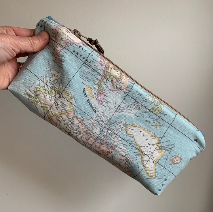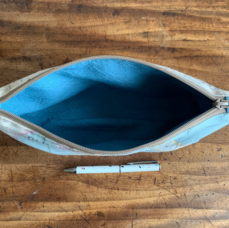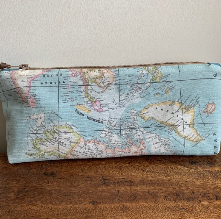 Spacious pencil case made from World Map cotton and lined with thick blue textured cotton. The wide bottom means there’s lots of space for all your stationery or you could use it for small projects like crochet.