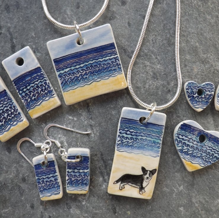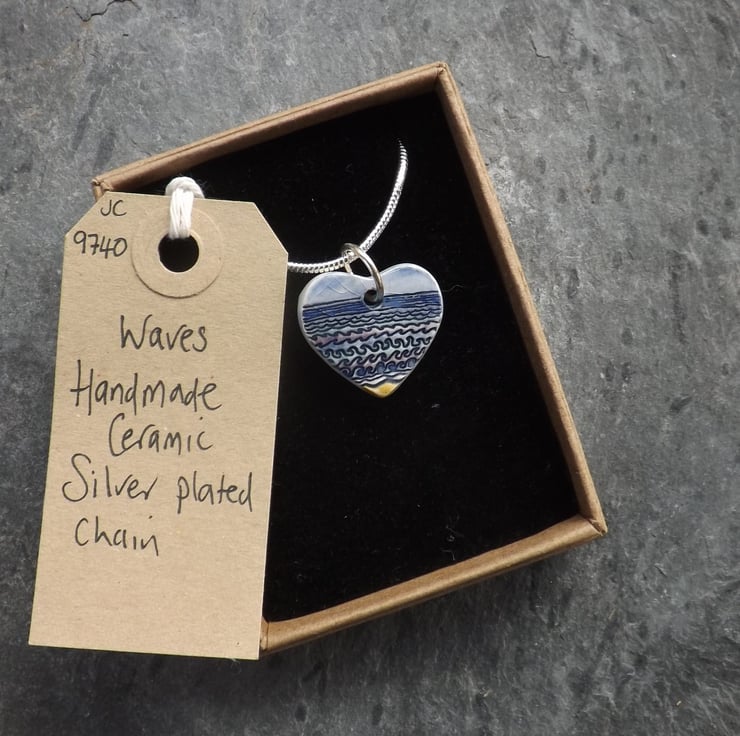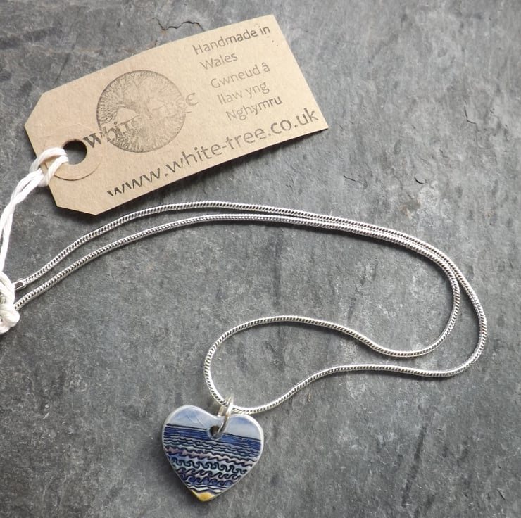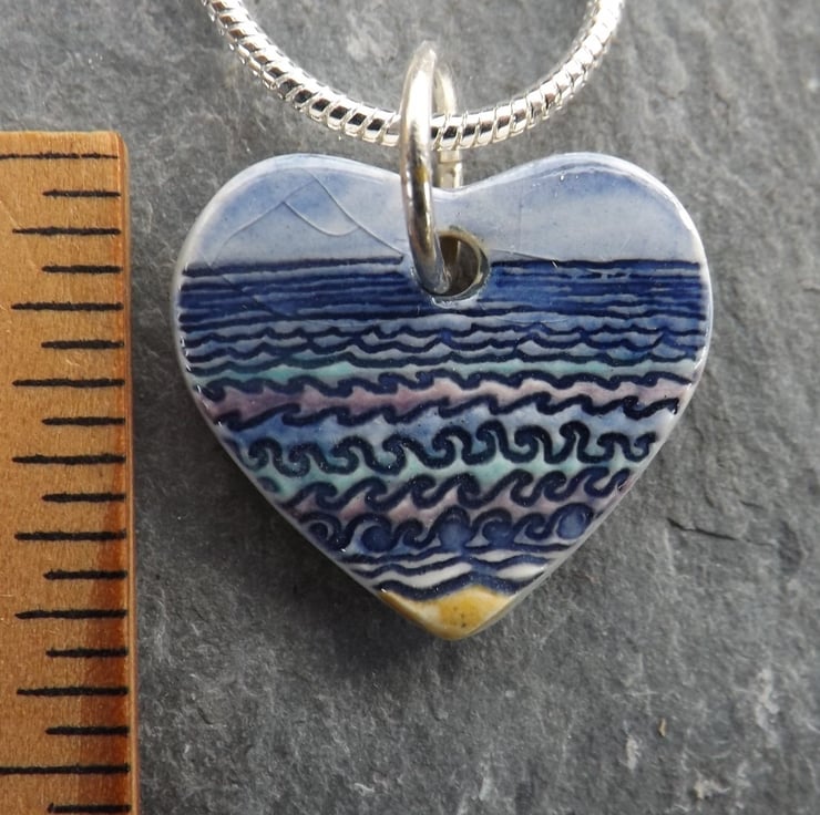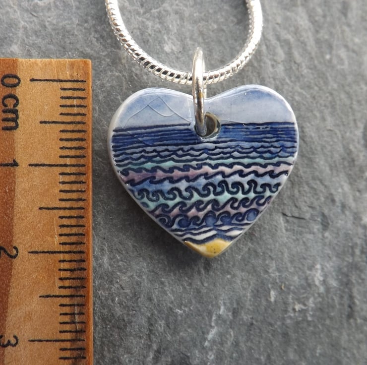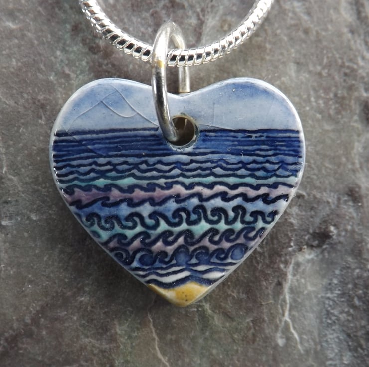This dainty heart pendant has a texture of waves pressed into the wet clay. Blue, turquoise and purple have been washed across the clay, to produce a pretty, stylised seascape, with a bit of yellow sand below.