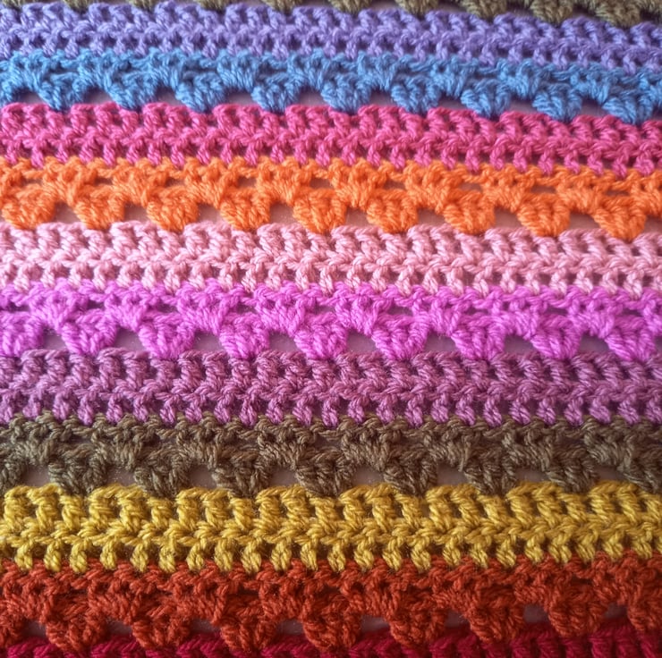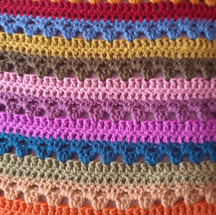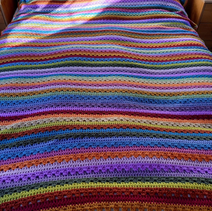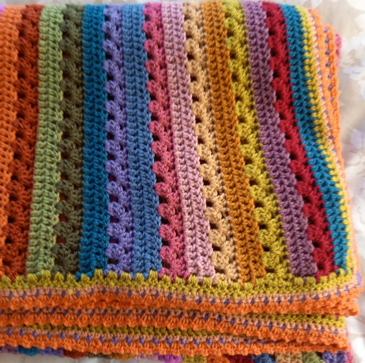 Colourful crochet blanket/ throw, very soft, warm and cosy, crocheted in a easy care machine washable yarn, in shades of blue, purple, pink, red, green, orange.
