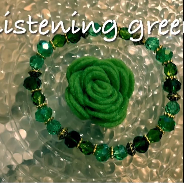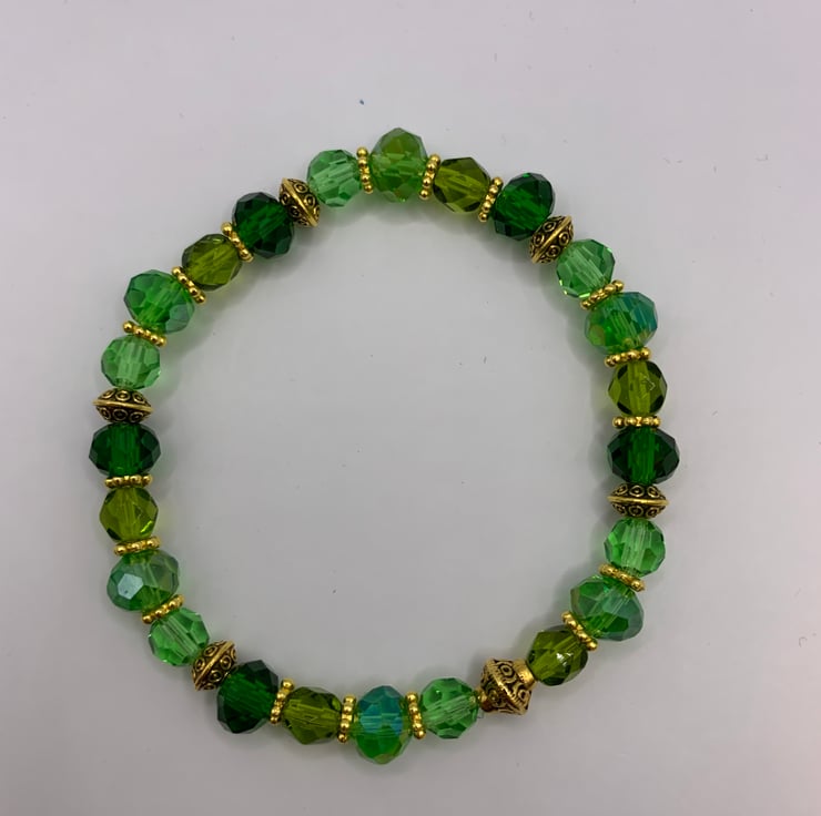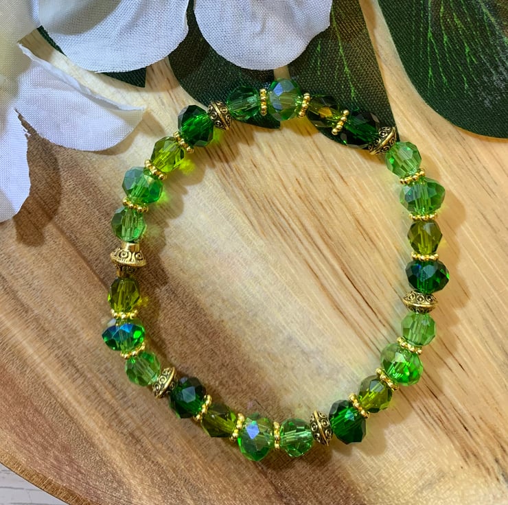 Shades of emeralds, gold accents, stretch bracelet. Preciosa Czech crystal bracelet, sparkling and vibrant. Made with beautiful clarity crystals and Tibetan antique gold beads. Fits average wrist size approx up to 8 inch.