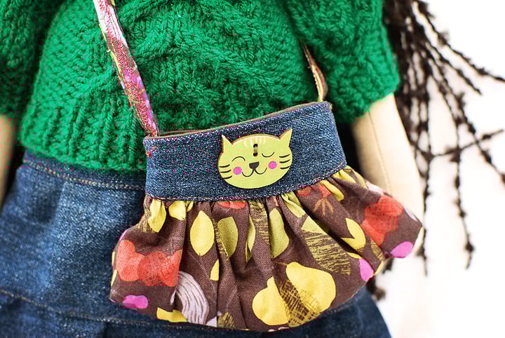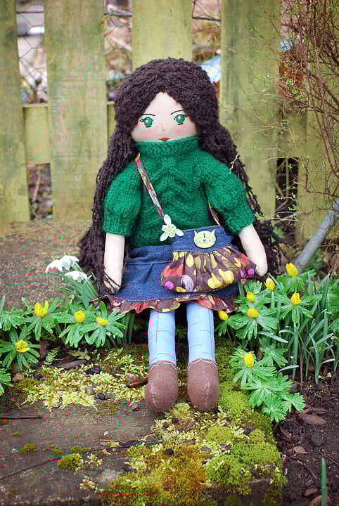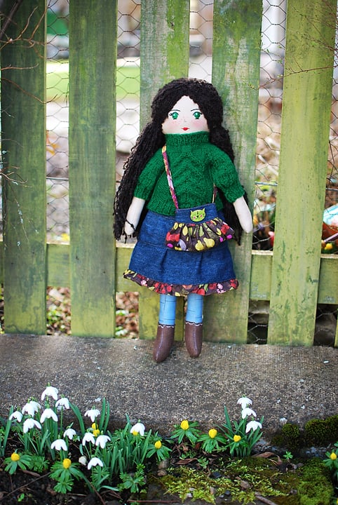 Clair`s sweater is hand knitted out of soft yarn in upside down stag horn pattern. The skirt is made of denim fabric. Clair has a beautiful denim bag with a cat button.