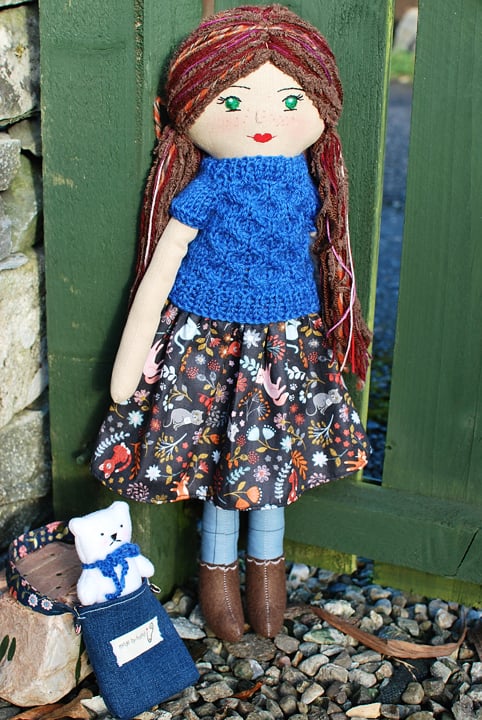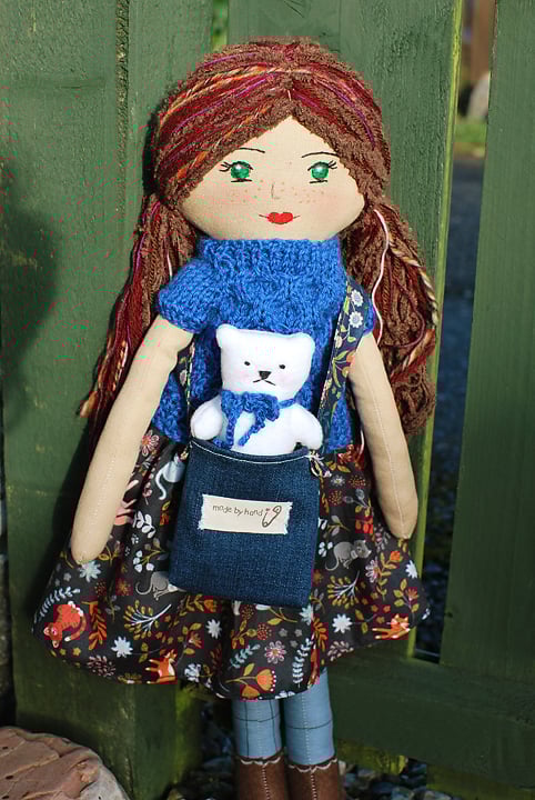 Nova's sweater is hand knitted out of soft pure merino wool in honey comb pattern. The skirt is made of soft cotton fabric with beautiful pattern. Nova has a tiny friend - the grumpy but cute white teddy bear who lives in her bag.