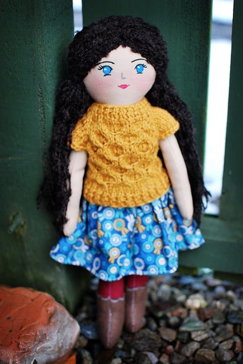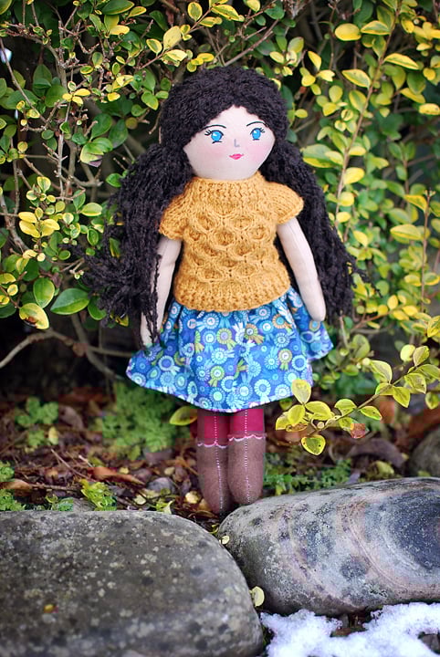 All clothes are removable. Susan's sweater is hand knitted out of soft pure wool in honey comb pattern. The skirt is made of soft cotton fabric with beautiful pattern.