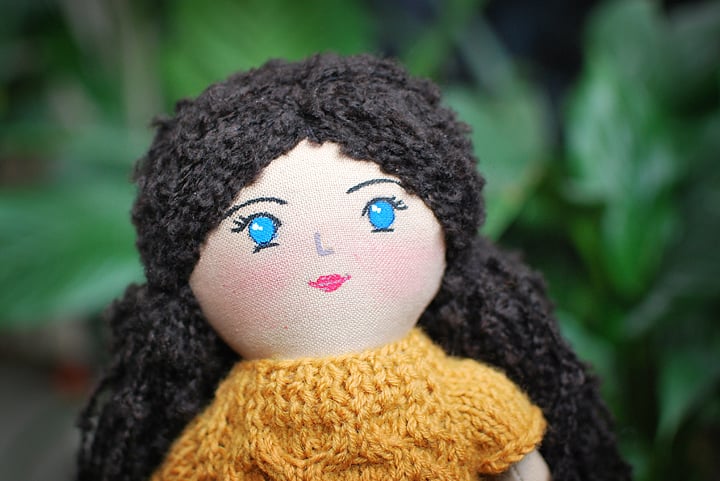 Facial features have been lovingly hand painted with nontoxic fabric paint. Her hair is made out of soft wool. Her arms are button joined.