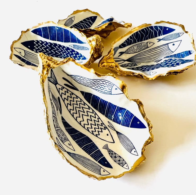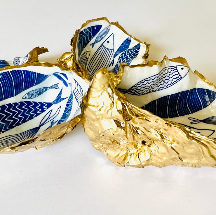 Once throughly dried each shell is meticulously painted gold, using a liquid real gold leaf, and then a layer of epoxy crystal clear resin is applied to the inside of shell to create a hard wearing gloss finish.