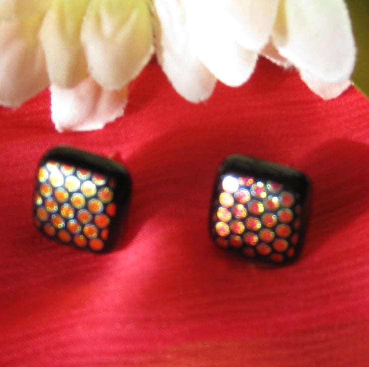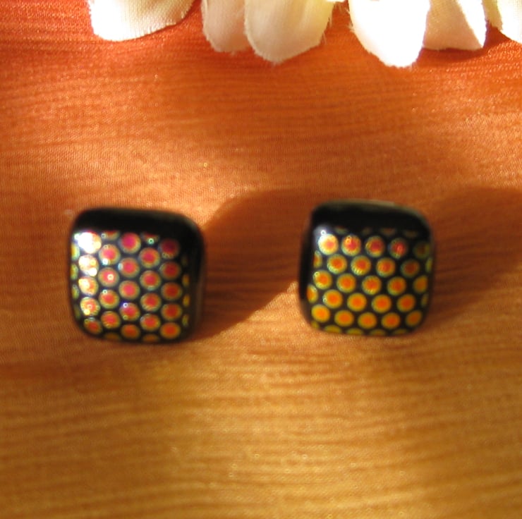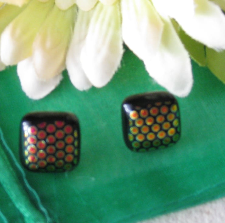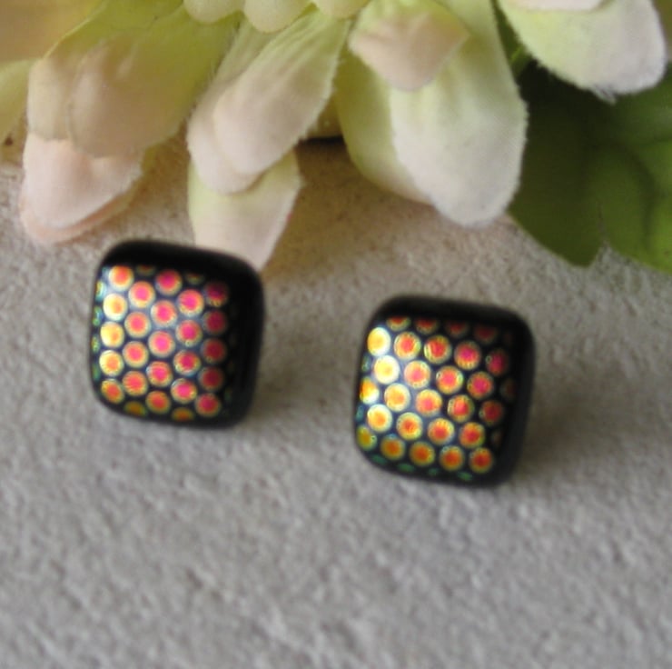 Handmade from quality glass - a pair of dichroic glass stud earrings with tiny dots pattern.