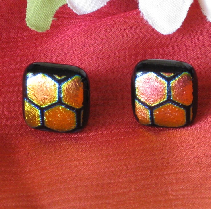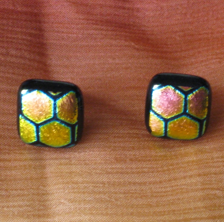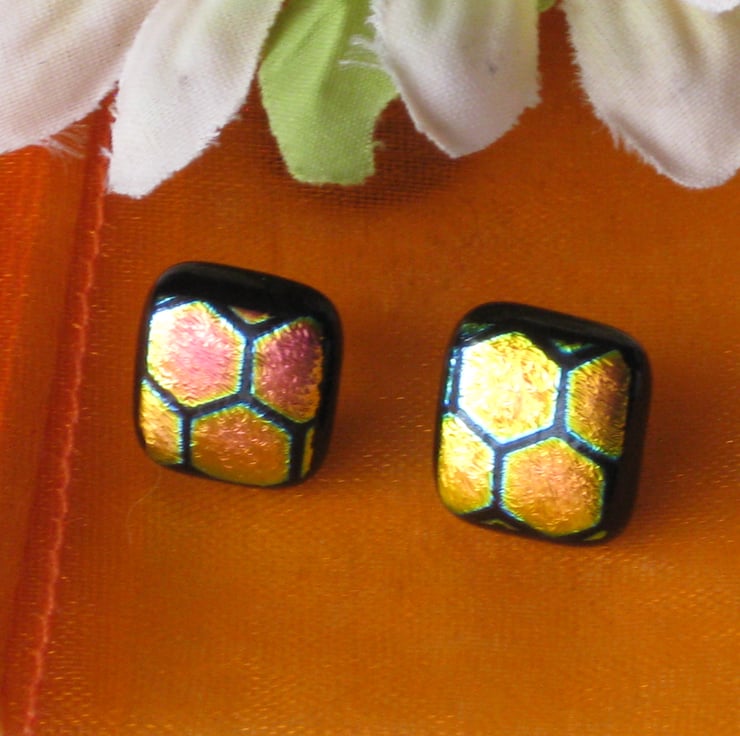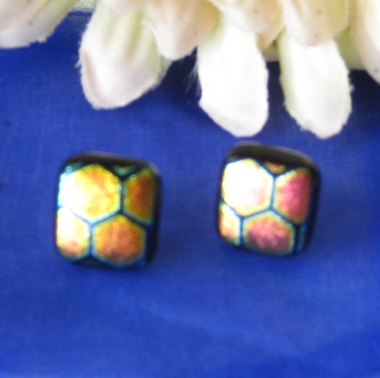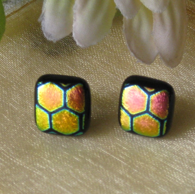 Pair of fused dichroic glass stud earrings with large honeycomb pattern.