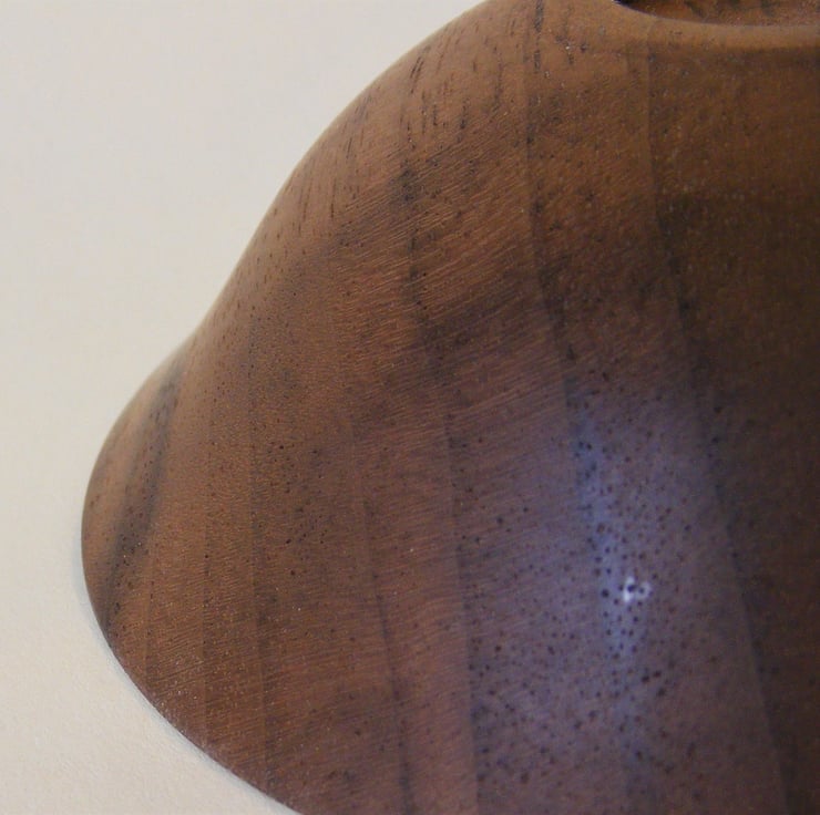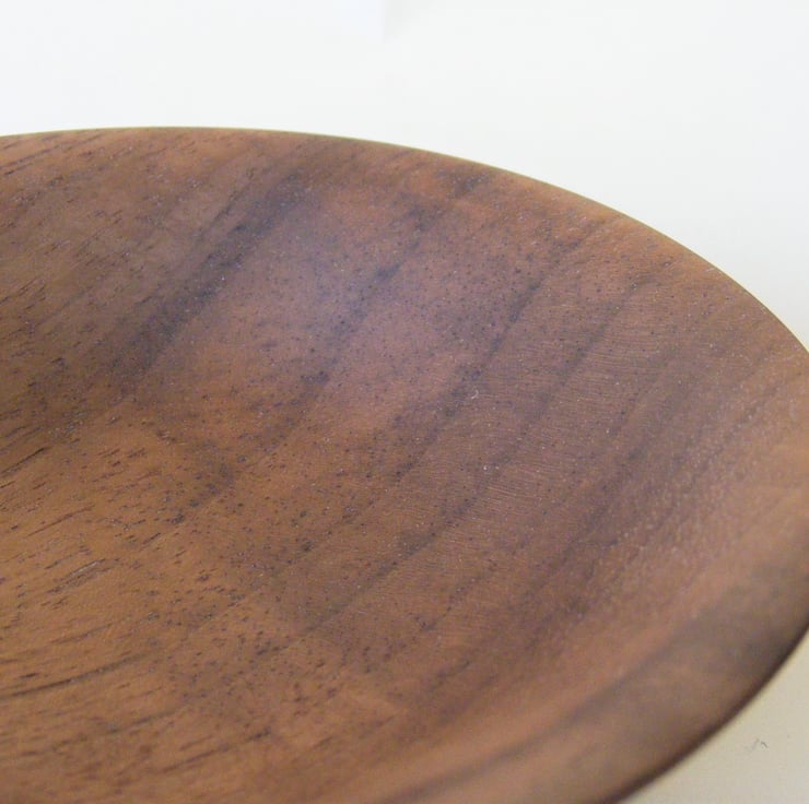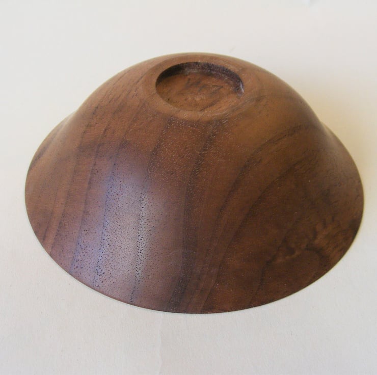 Small Walnut bowl, 105 x 35mm, A nice delicate Walnut bowl, with a thin rim and narrow base, it is a lovely curving ogee shape. The colour is a rich brown with darker lines of grain in chocolate colours. A lovely decorative piece for a small space or home for small objects.