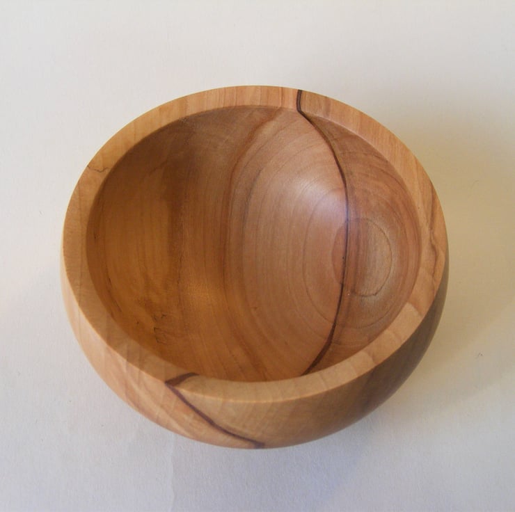 Small Spalted Horse Chestnut bowl, 100 x 43mm, A small but striking decorative bowl in Spalted Horse Chestnut. Its in a closed form shape, curving in towards the top with an inturned rim and narrow base. The colours are amazing with swirls and streaks of browns and pink hues with a darker line running through the piece. It would make a nice addition to any space.