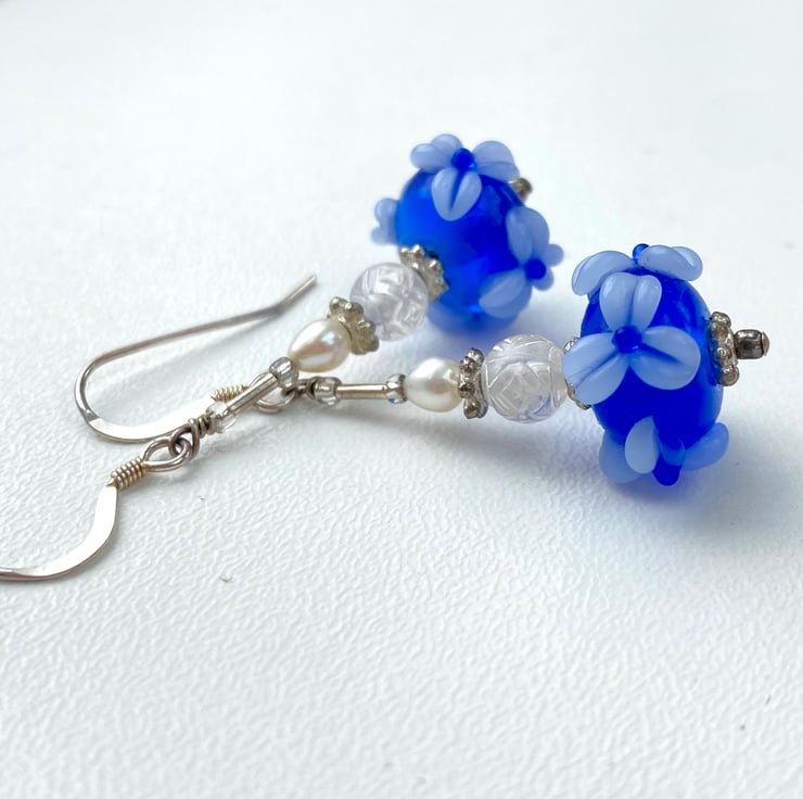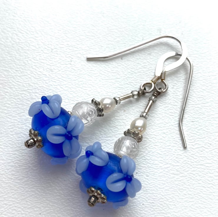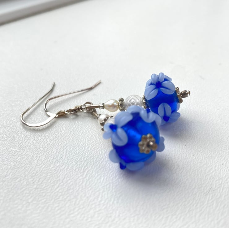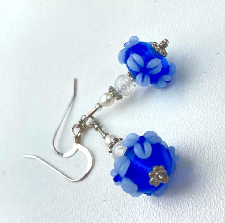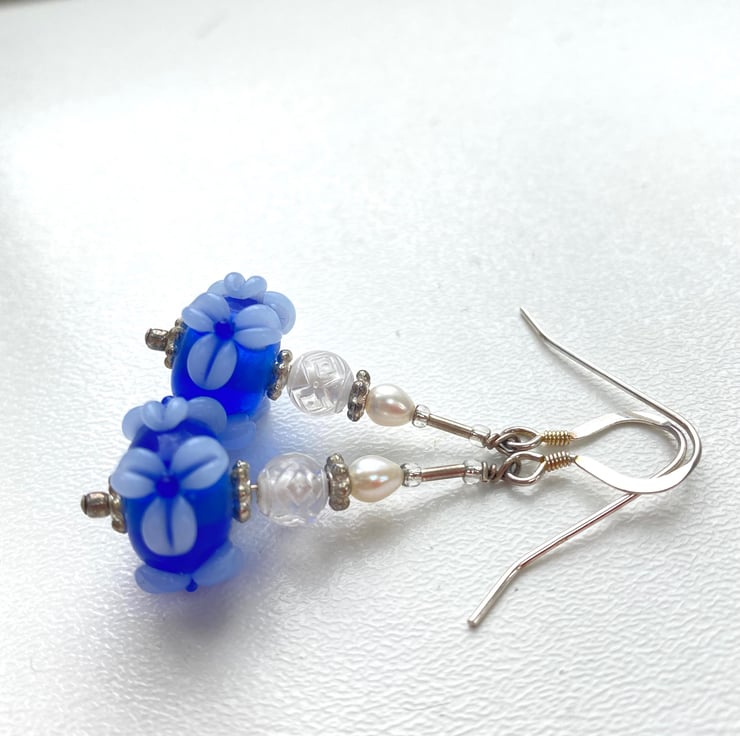 It's stopped raining, and outside is full of golden light, the garden is blooming and the blooms bright, so inspiration struck and I have been making flower jewellery. The beautiful beads have Pale blue and white dots and shining pearls make these very luxurious, the silver fittings are gentle on even the most sensitive skin.
