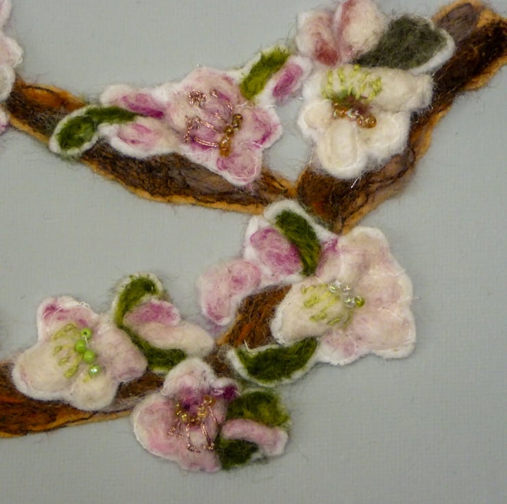 When I discovered felting I found it so creative colour mixing the wool rovings. I then combined my feltwork with my love of embroidery to create artworks using seasonal flowers from my garden. I find this work very tactile and enjoy moulding and sculpting the flowers onto the canvas to give them a slightly 3 dimensional finish. They are firm to touch and can be gently vacuumed if dusty.