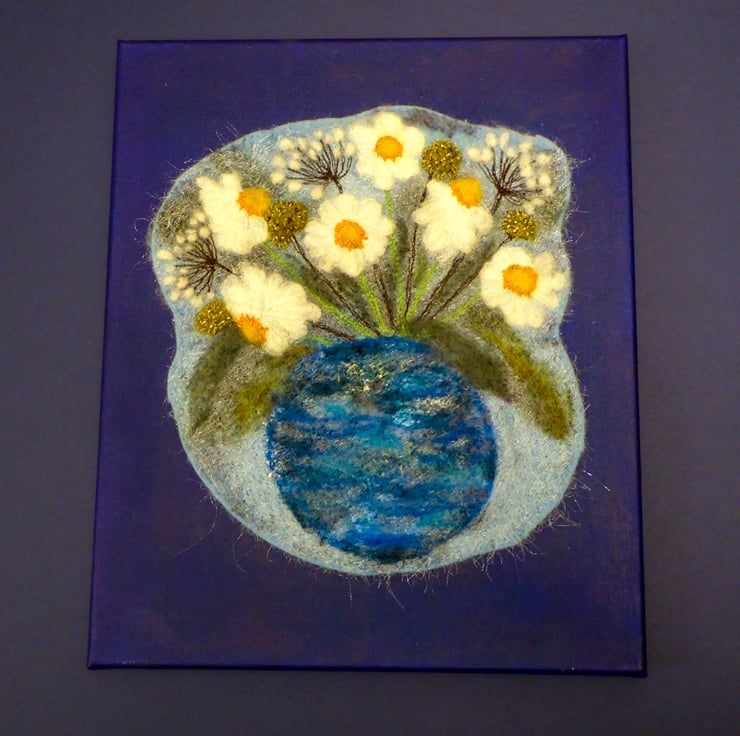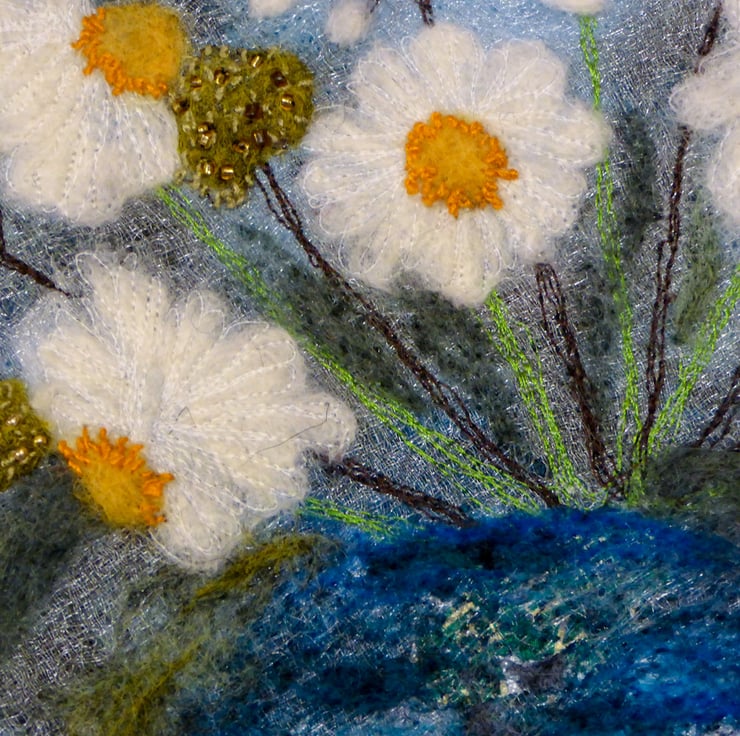 My textile artworks are hand felted, then embellished with machine and hand stitched embroidery with added hand stitched beads. They are then stitched by hand onto a painted canvas making them ready to hang on your wall to enjoy. These bright white daisies with golden yellow centres with seed heads fill a multicoloured felted wool blended blue pot. The composition helps cultivate a feeling of summertime in the depths of winter.