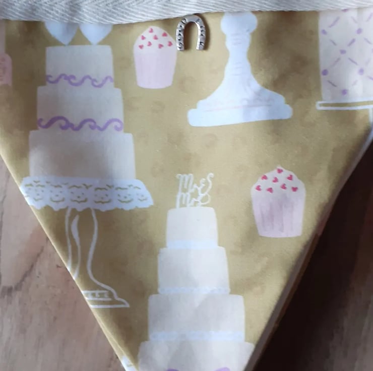 This beautiful little string of bunting would be perfect for dressing your cake table. It is handmade and has tiny little good luck horse shoes sewn in.