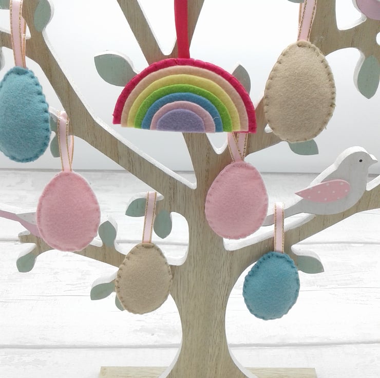 This is a set of 7 felt Easter/Spring decorations, comprising of 6 eggs and 1 pastel rainbow of hope.