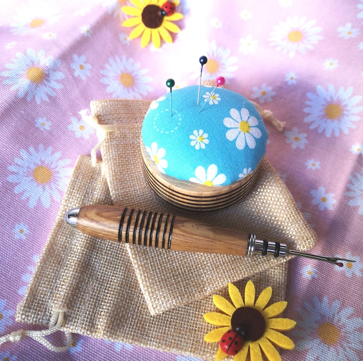 If you know someone who loves to sew we're sure they would appreciate this unique bundle. A cute pin cushion housed on top of a wood turned based and a tactile seam ripper to treasure for years. A wonderful addition to any Crafter's sewing box and perfect for gifting.