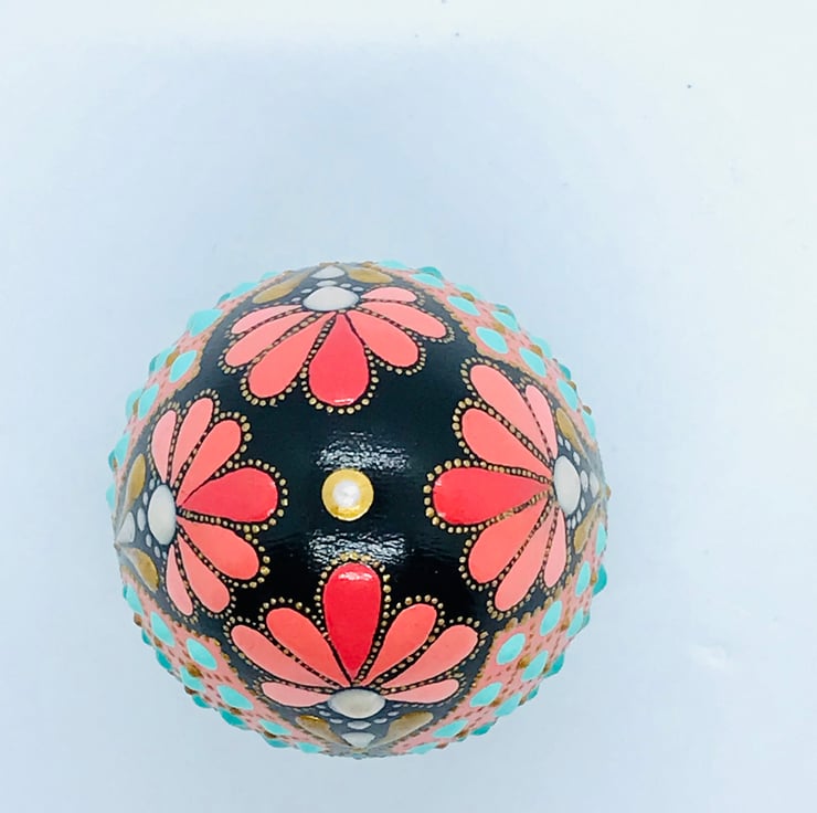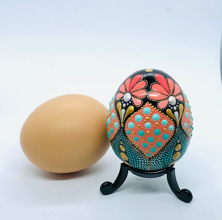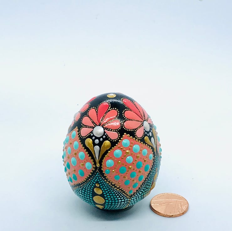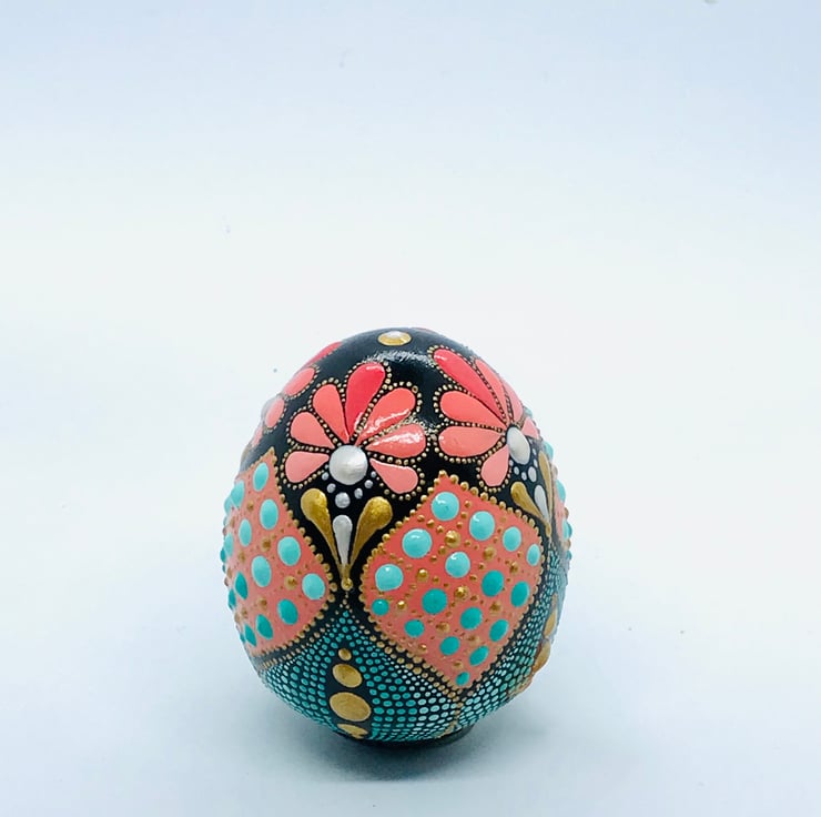 About the size of a hen’s egg, this freestanding flat bottomed egg is made of very hard plaster and hand painted in dotting style.