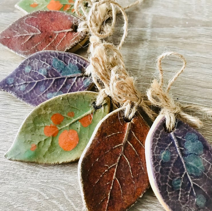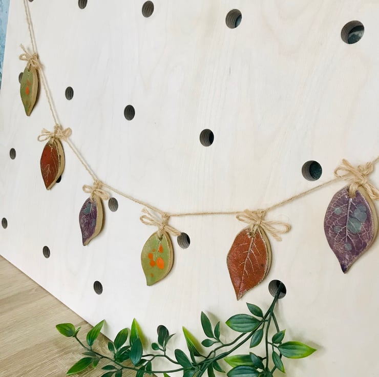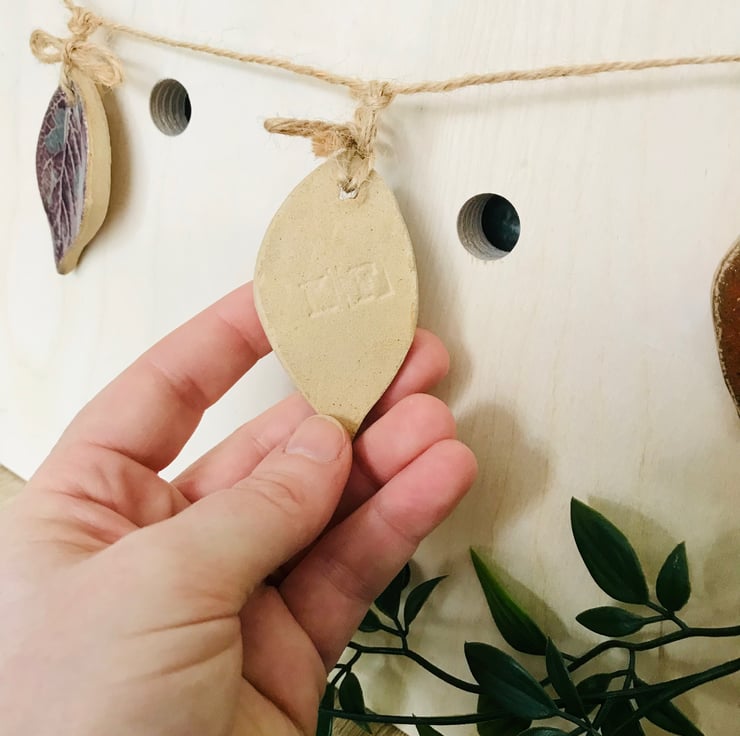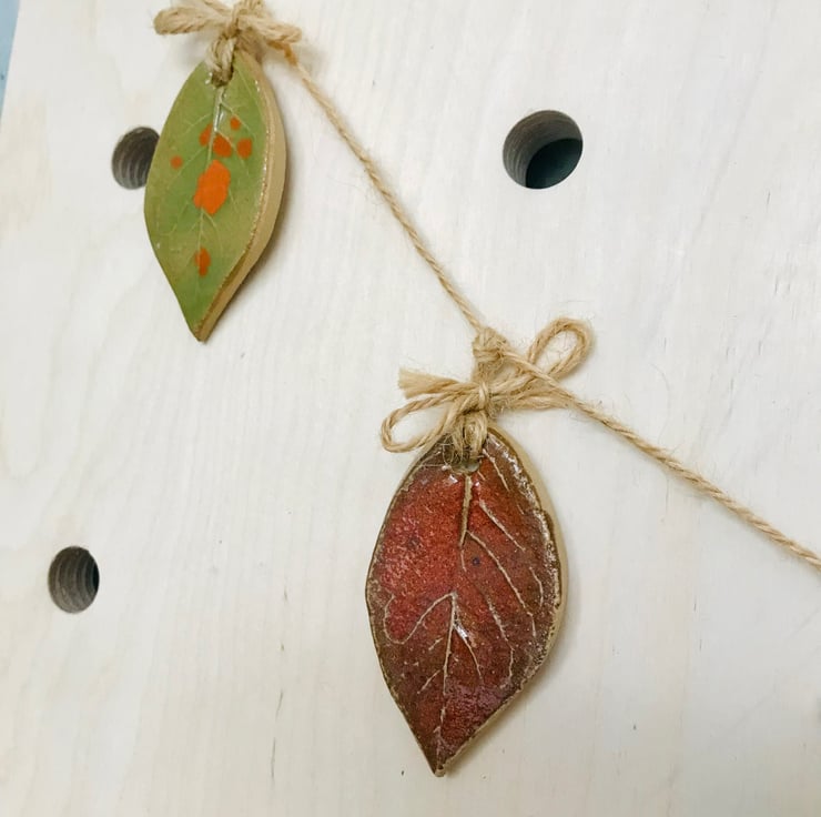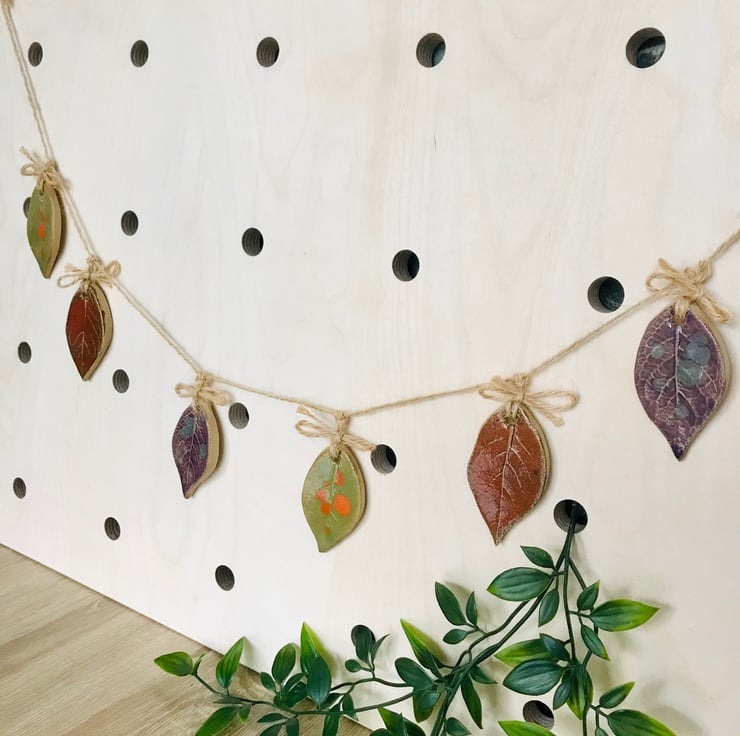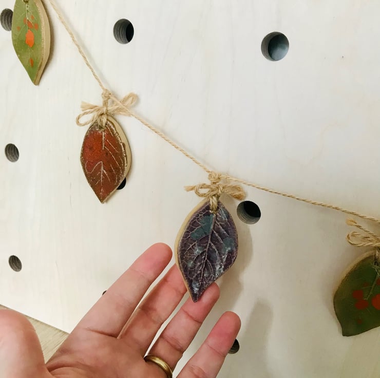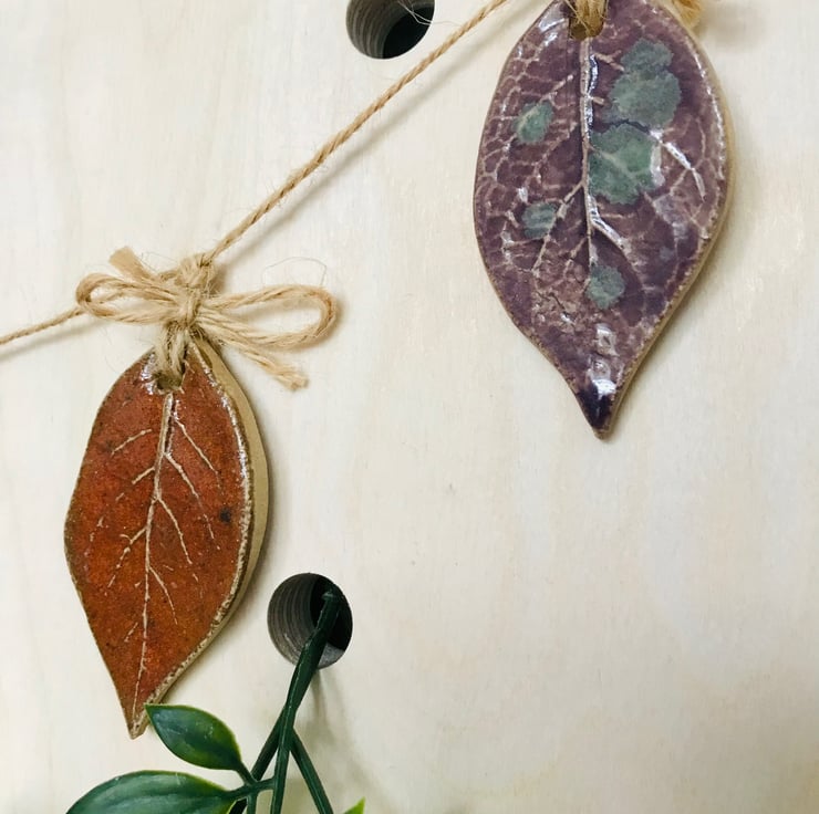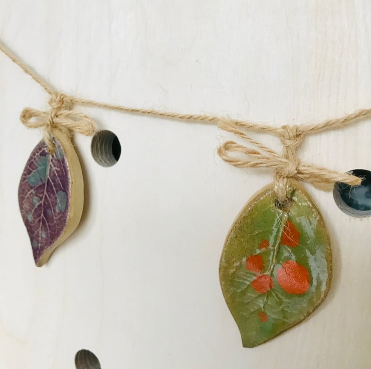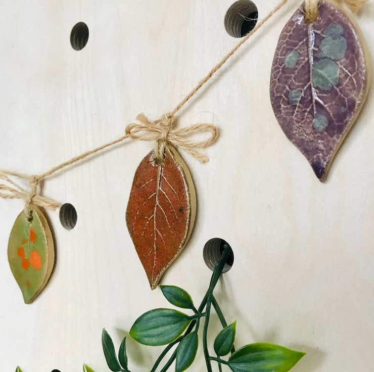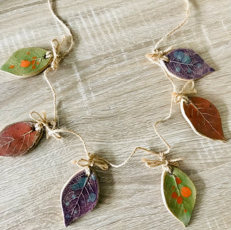 Inspired by the beautiful colours of autumn. This little leaf Garland with its hand printed leaf textures and beautiful rich stoneware colours will remind you of that gorgeous time of year all year round.